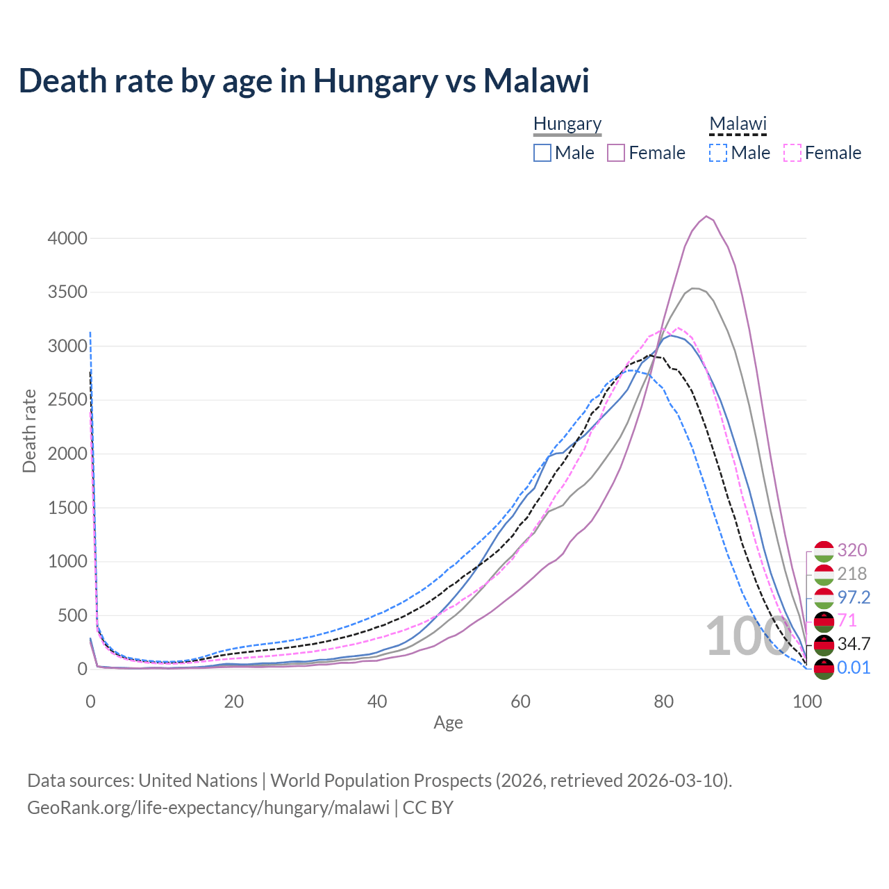 This life expectancy calculator shows the odds of living to 100, 95, 90, and below based on current age for both males and females in Hungary and Malawi, along with mean and median age of death. The calculations are based on the 2026 life tables (actuarial tables) from the UN World Population Prospects.