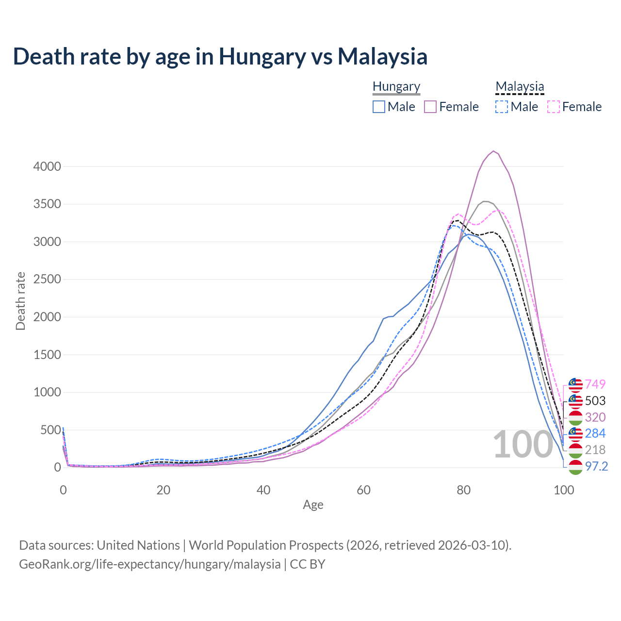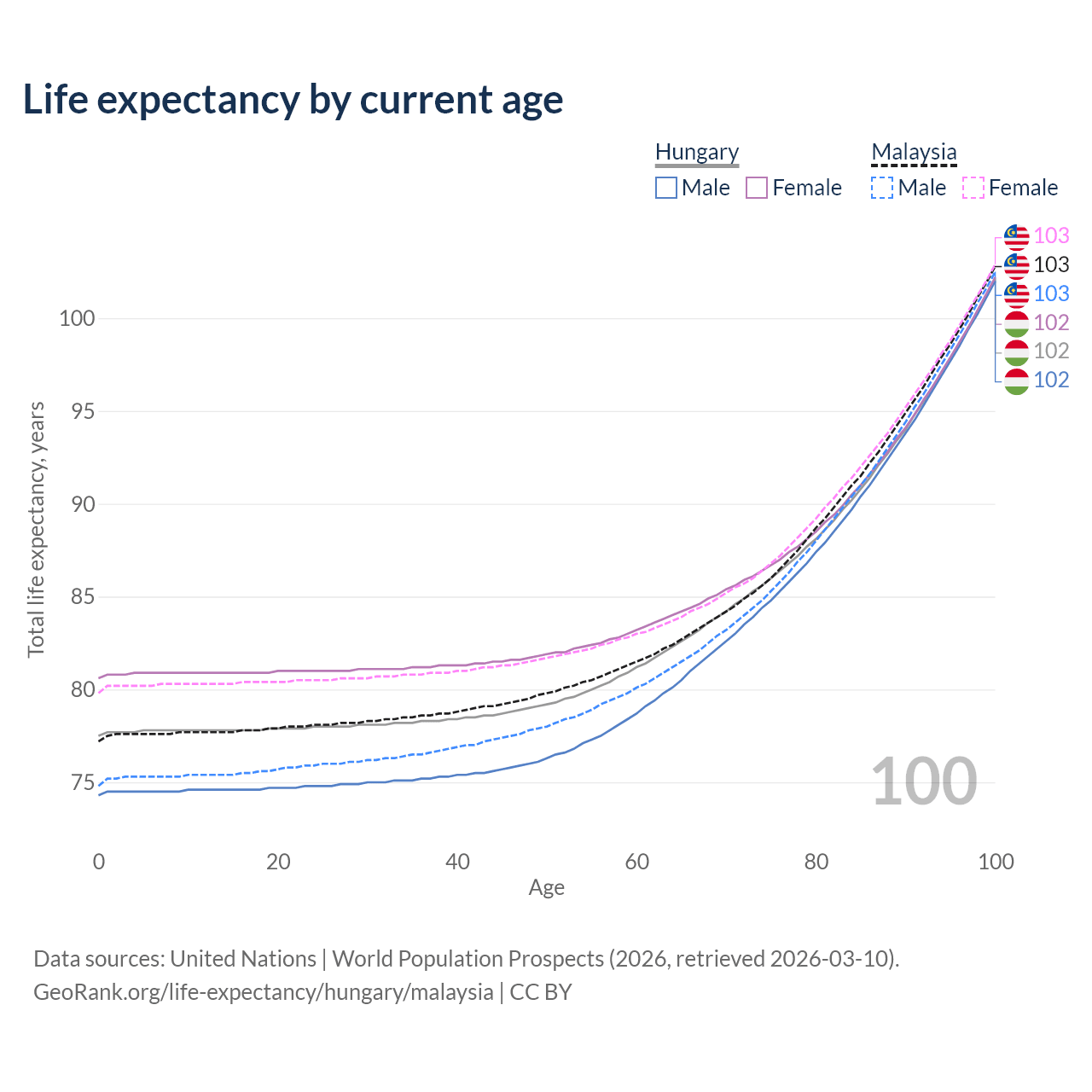 This life expectancy calculator shows the odds of living to 100, 95, 90, and below based on current age for both males and females in Hungary and Malaysia, along with mean and median age of death. The calculations are based on the 2026 life tables (actuarial tables) from the UN World Population Prospects.