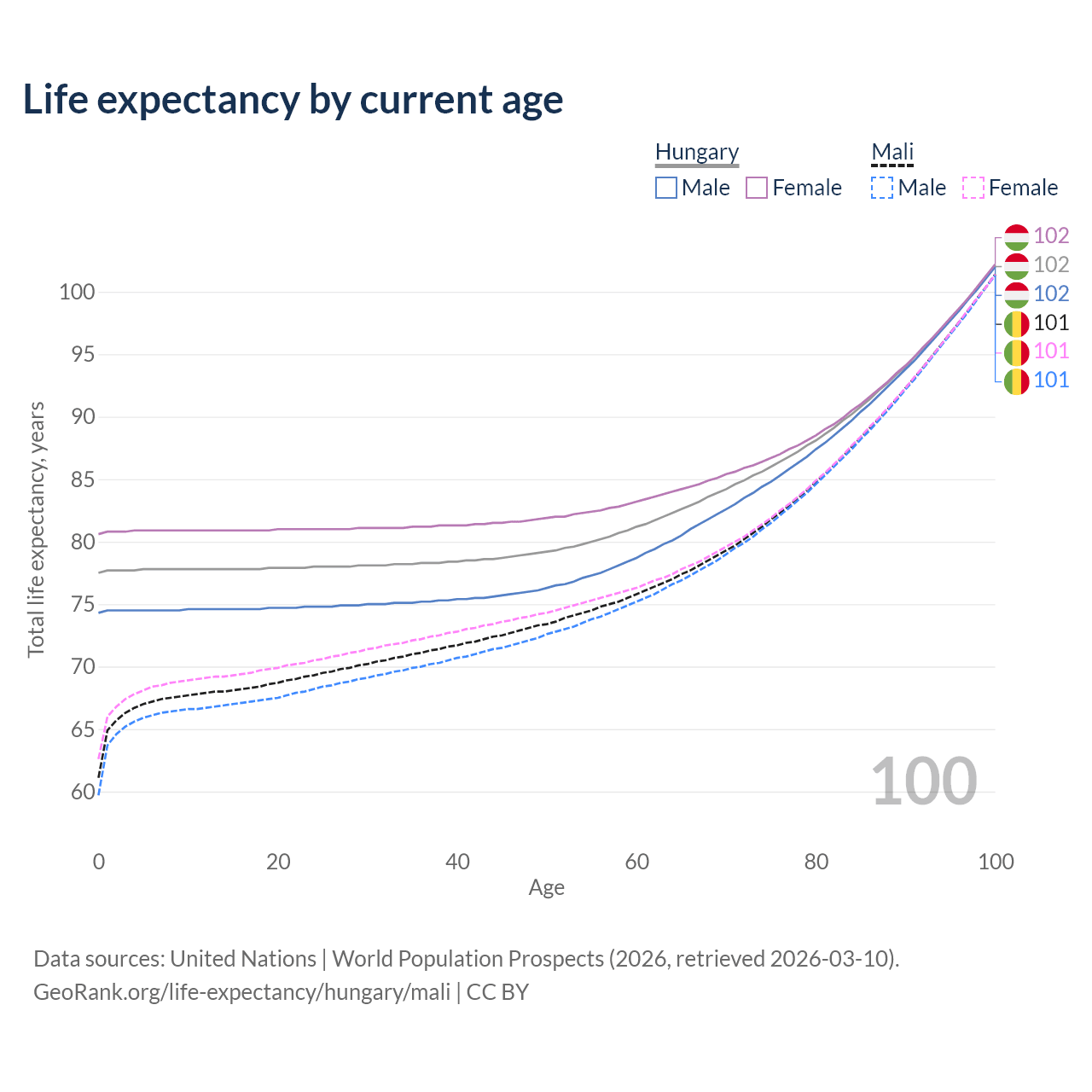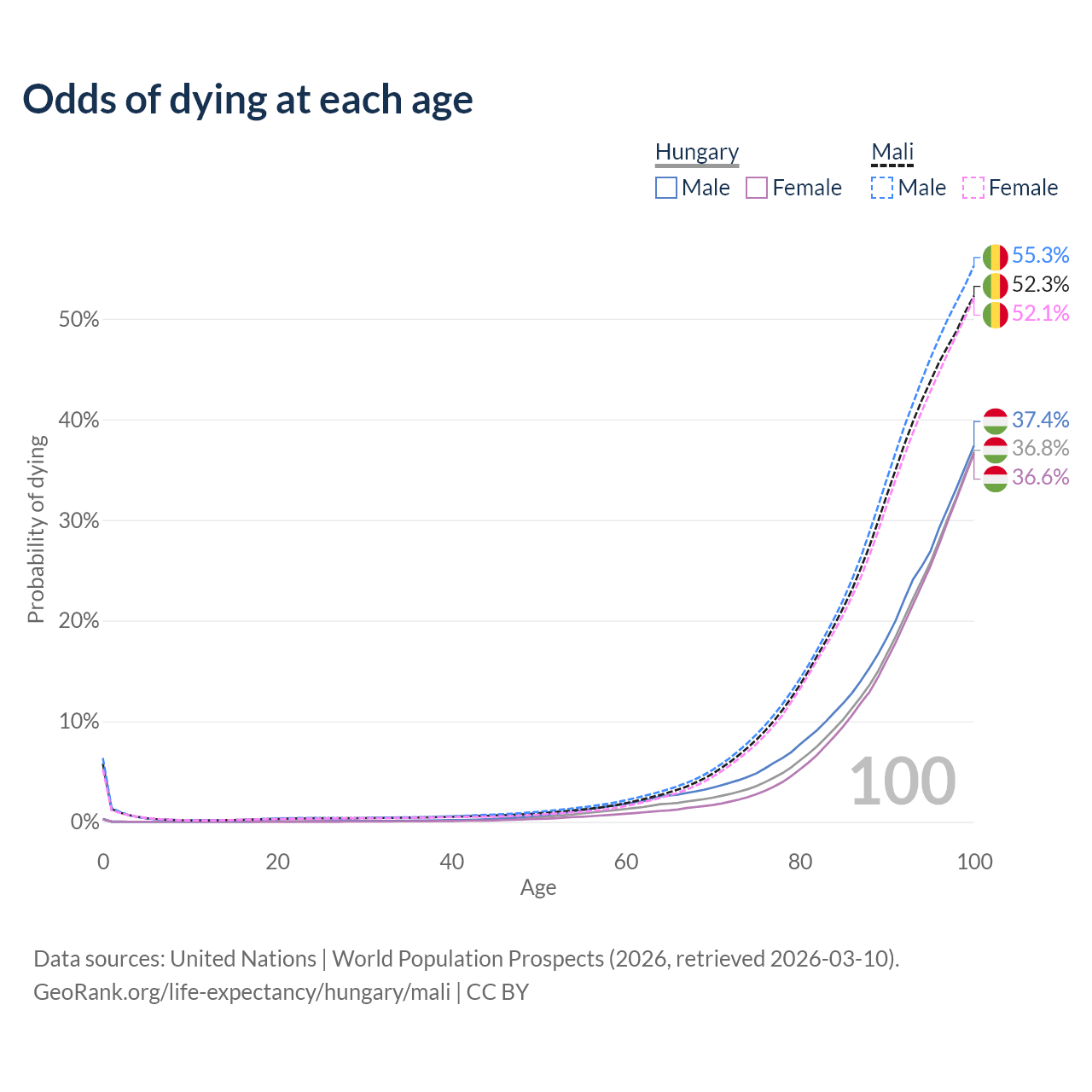 This life expectancy calculator shows the odds of living to 100, 95, 90, and below based on current age for both males and females in Hungary and Mali, along with mean and median age of death. The calculations are based on the 2026 life tables (actuarial tables) from the UN World Population Prospects.