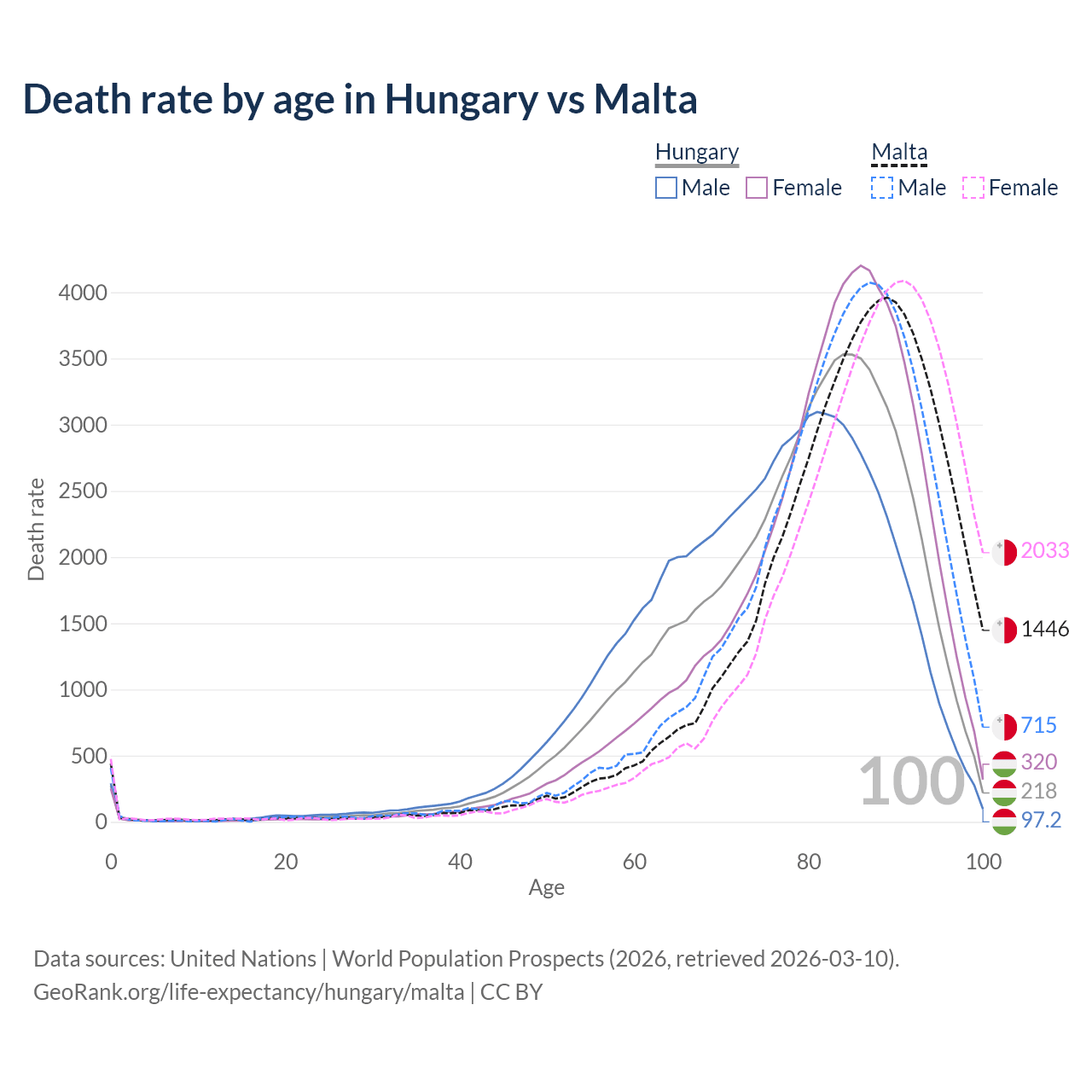 In Hungary, the most common age of death is 84, compared to 89 in Malta. The median age of death is 80.4 in Hungary and 86.3 in Malta, meaning only half of each cohort is expected to live past that age.