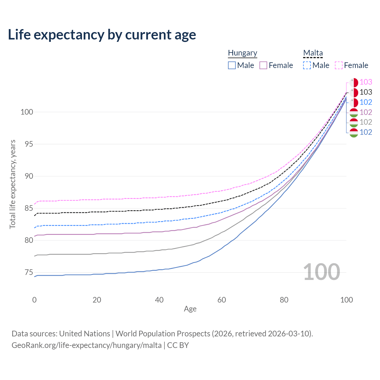 This life expectancy calculator shows the odds of living to 100, 95, 90, and below based on current age for both males and females in Hungary and Malta, along with mean and median age of death. The calculations are based on the 2026 life tables (actuarial tables) from the UN World Population Prospects.