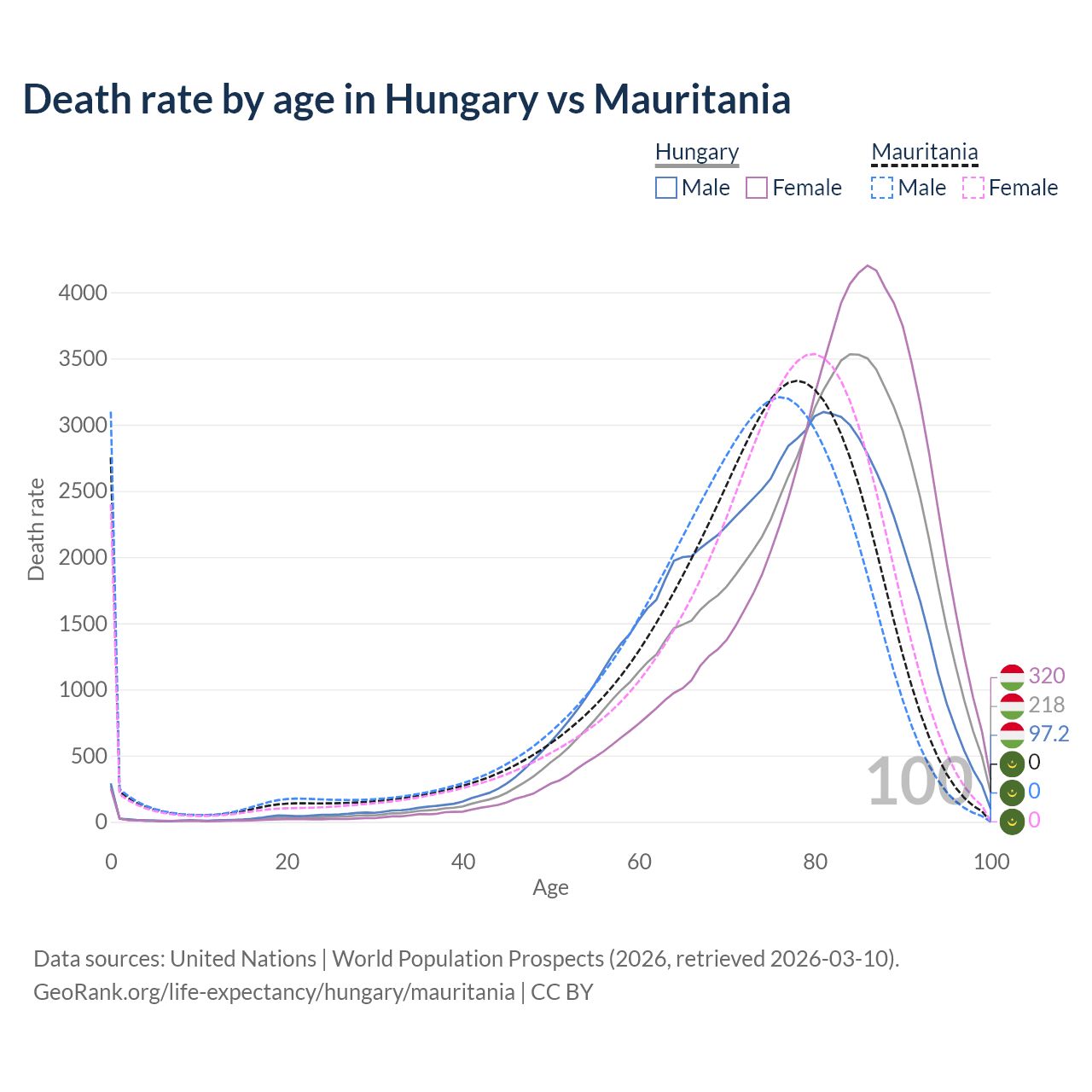 In Hungary, the most common age of death is 84, compared to 78 in Mauritania. The median age of death is 80.4 in Hungary and 74.1 in Mauritania, meaning only half of each cohort is expected to live past that age.