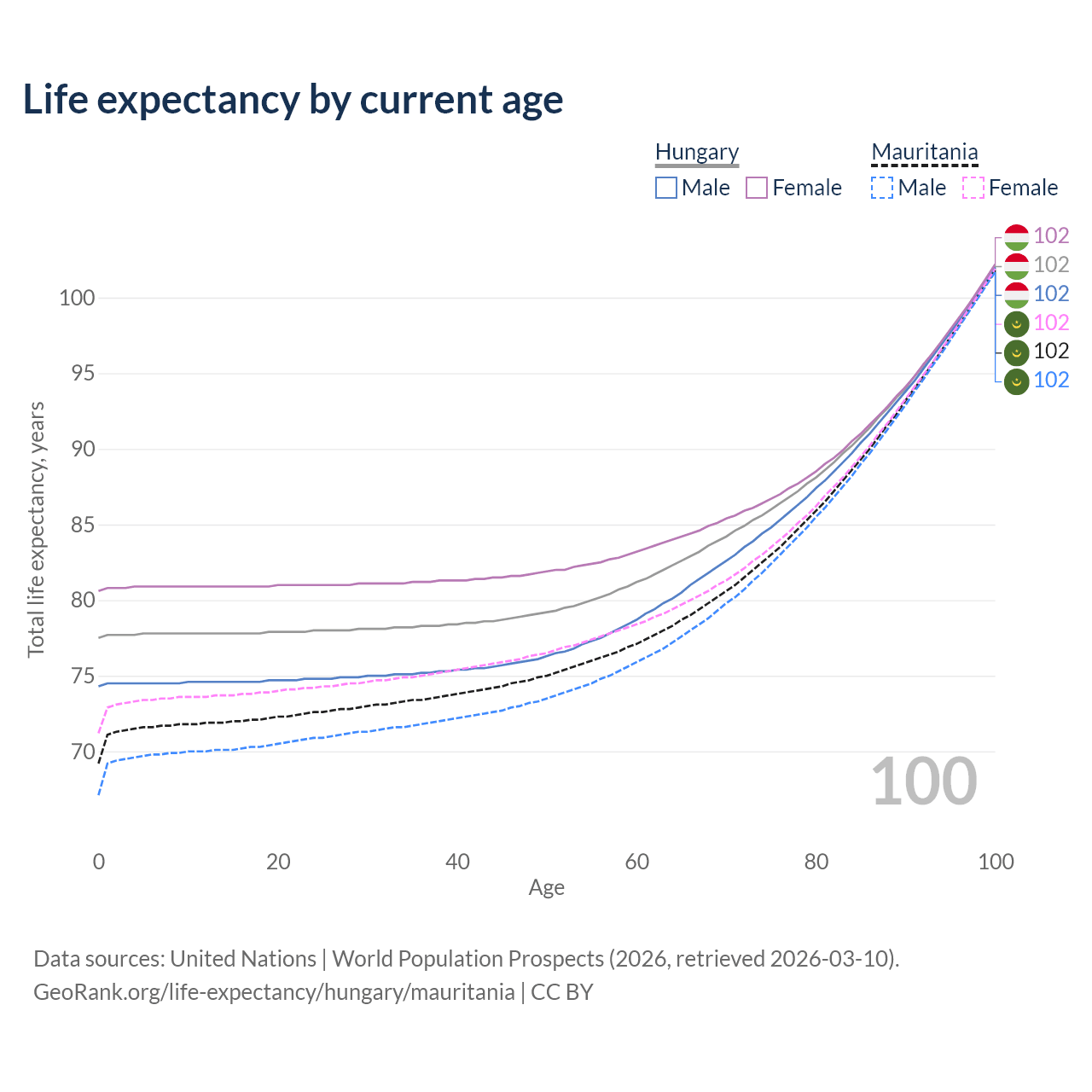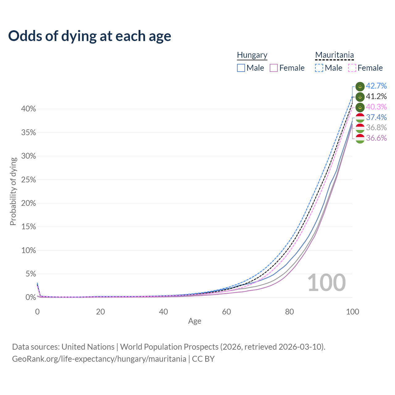 This life expectancy calculator shows the odds of living to 100, 95, 90, and below based on current age for both males and females in Hungary and Mauritania, along with mean and median age of death. The calculations are based on the 2026 life tables (actuarial tables) from the UN World Population Prospects.