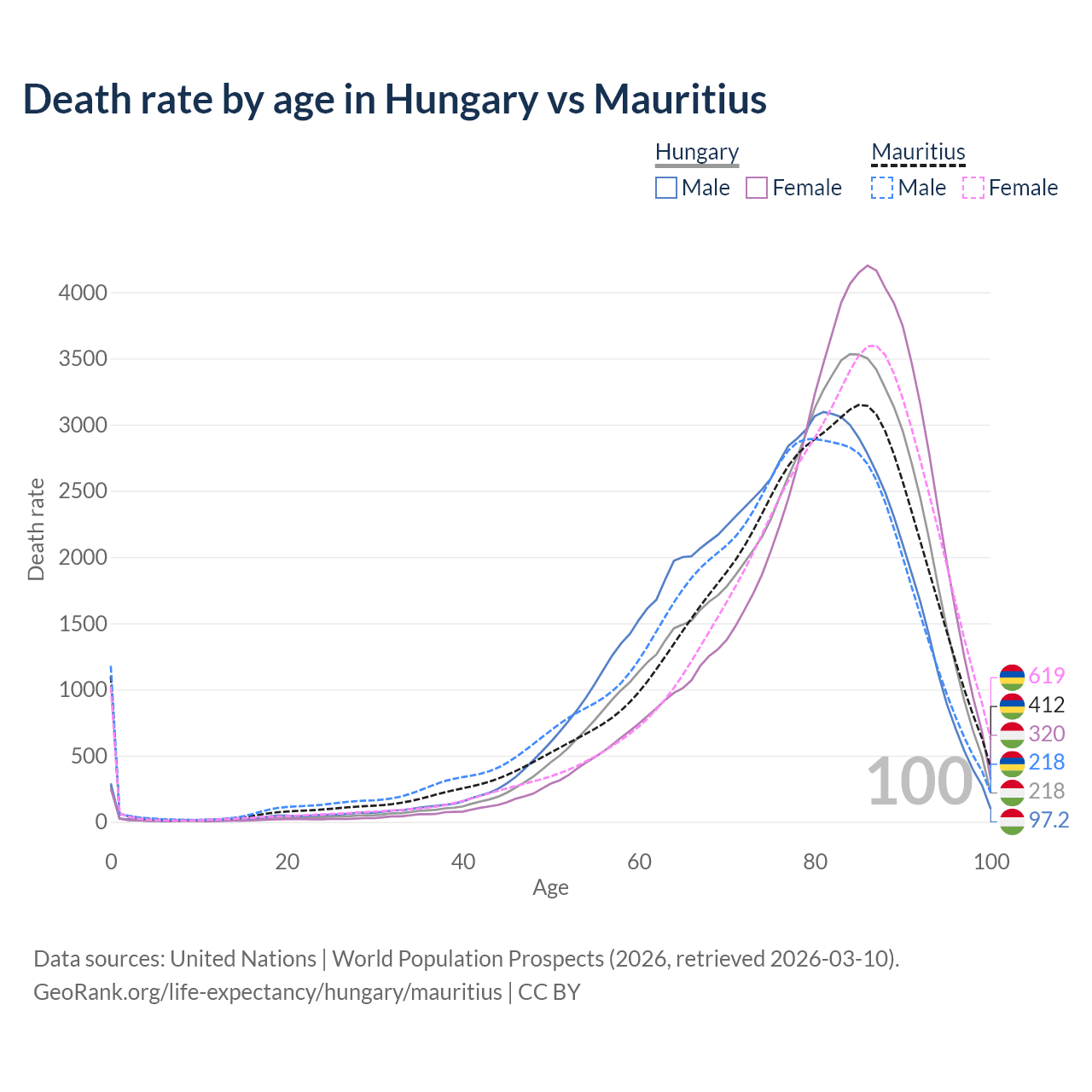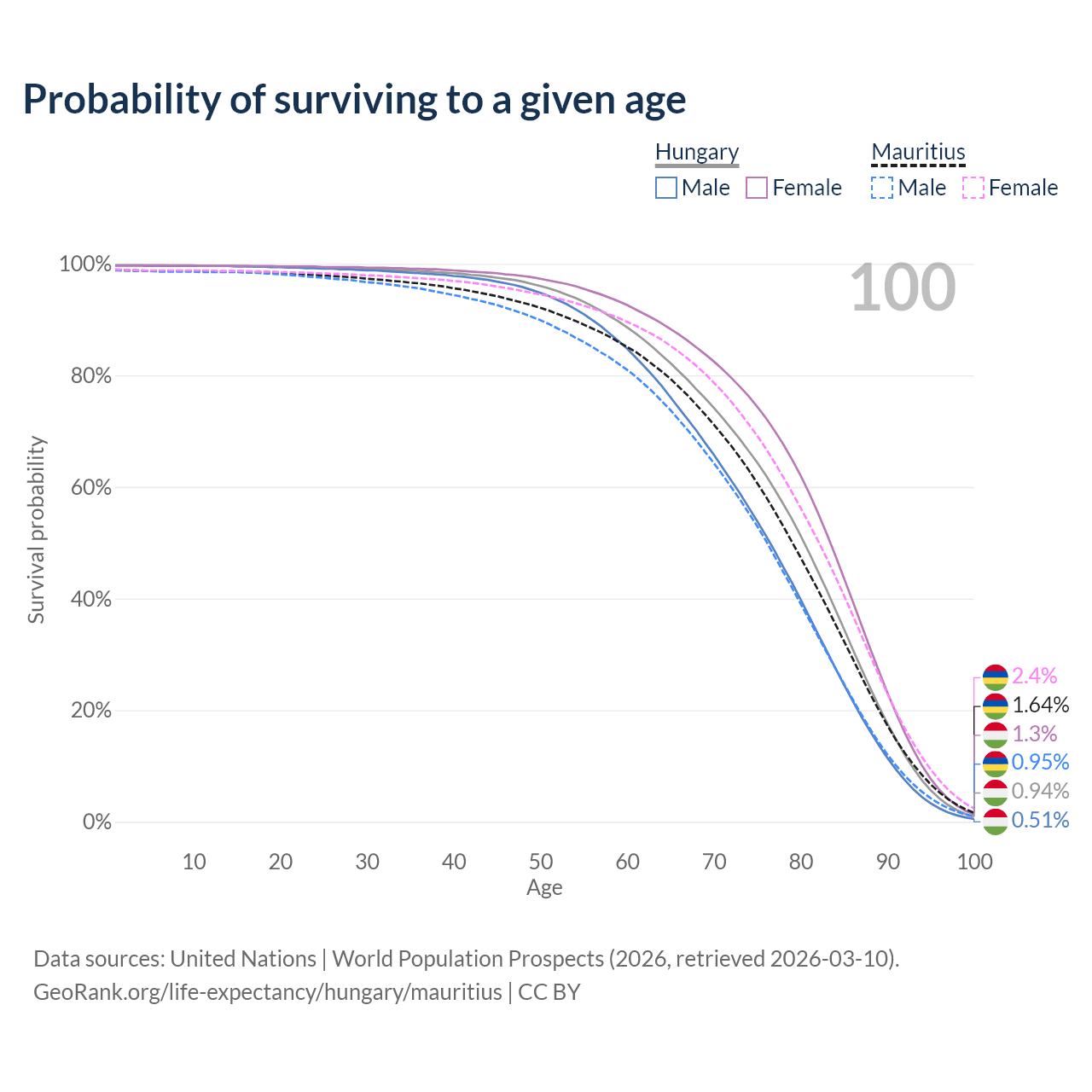 This life expectancy calculator shows the odds of living to 100, 95, 90, and below based on current age for both males and females in Hungary and Mauritius, along with mean and median age of death. The calculations are based on the 2026 life tables (actuarial tables) from the UN World Population Prospects.