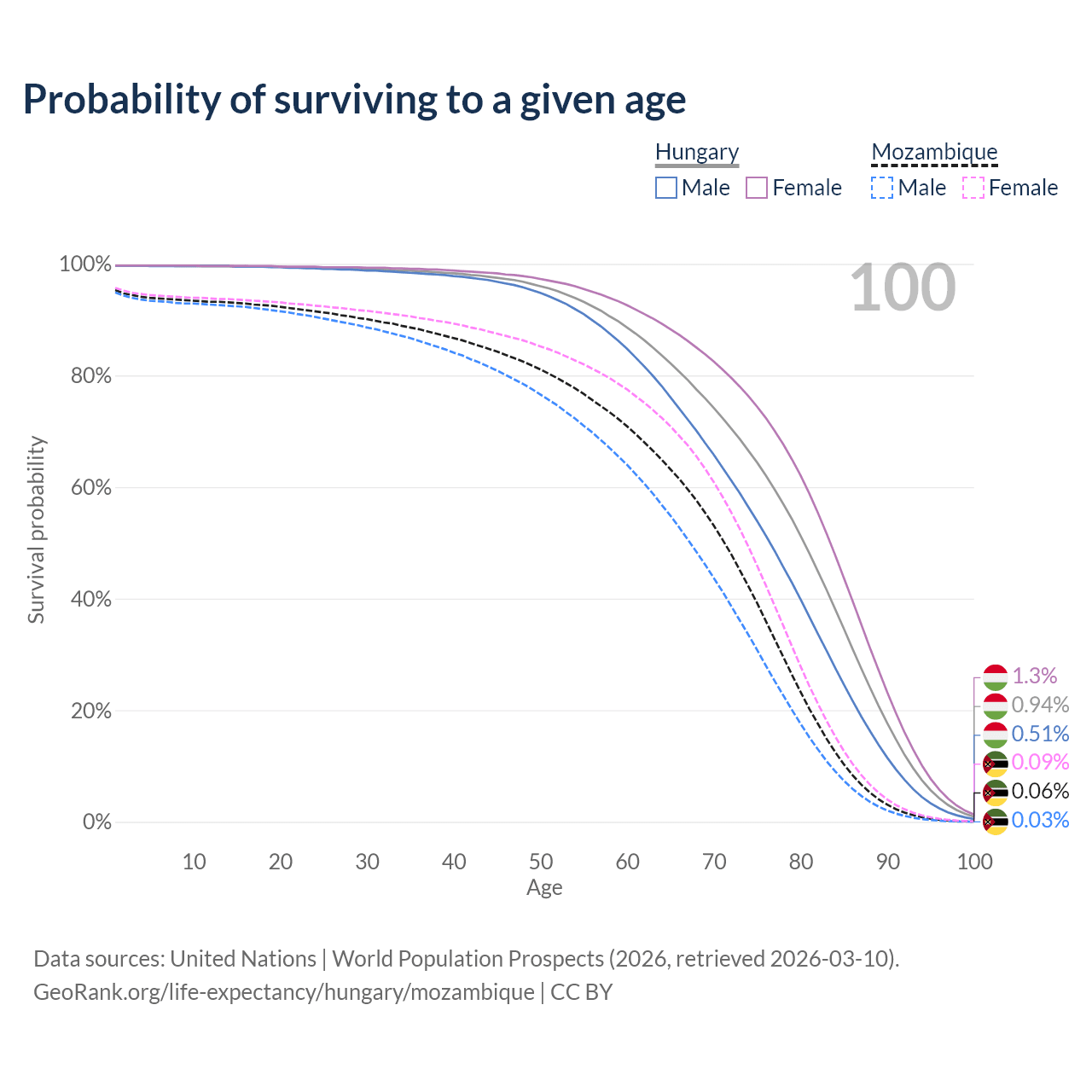 This life expectancy calculator shows the odds of living to 100, 95, 90, and below based on current age for both males and females in Hungary and Mozambique, along with mean and median age of death. The calculations are based on the 2026 life tables (actuarial tables) from the UN World Population Prospects.