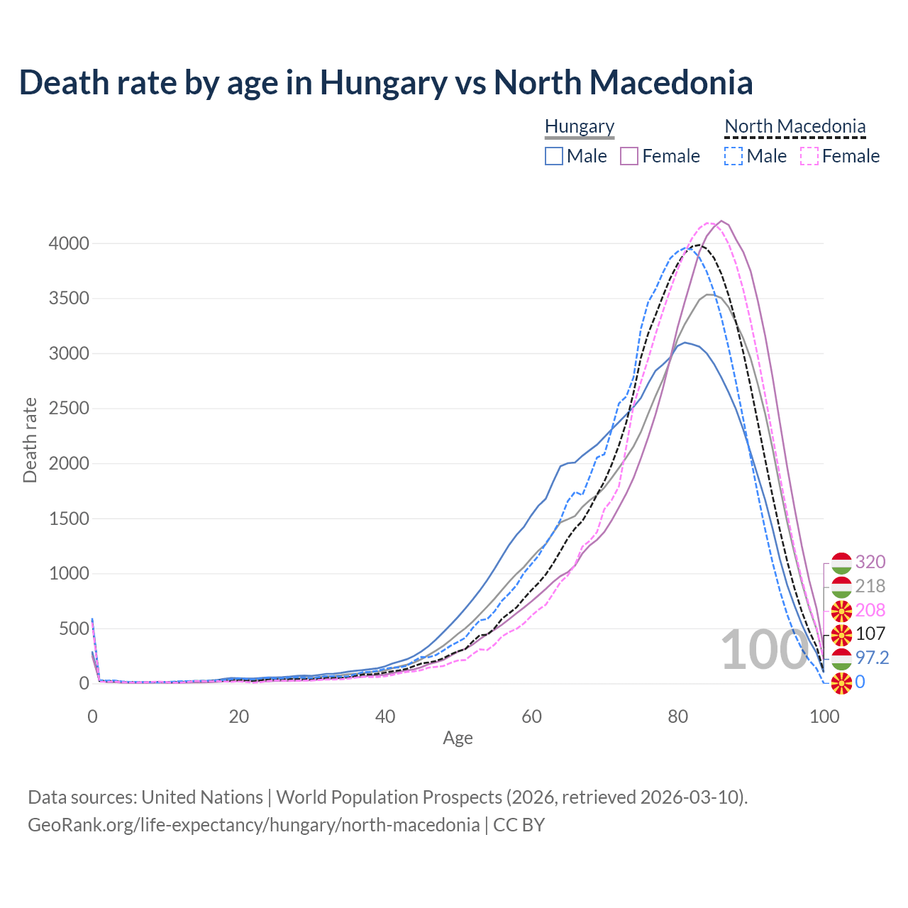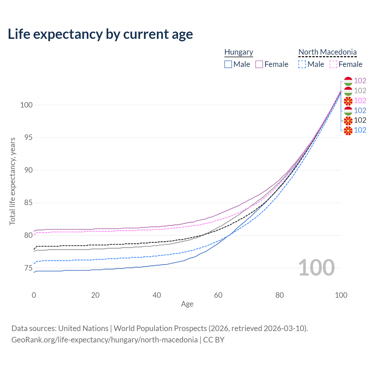 This life expectancy calculator shows the odds of living to 100, 95, 90, and below based on current age for both males and females in Hungary and North Macedonia, along with mean and median age of death. The calculations are based on the 2026 life tables (actuarial tables) from the UN World Population Prospects.