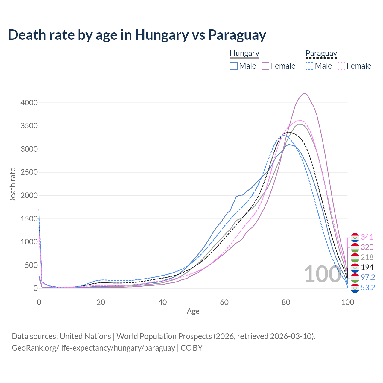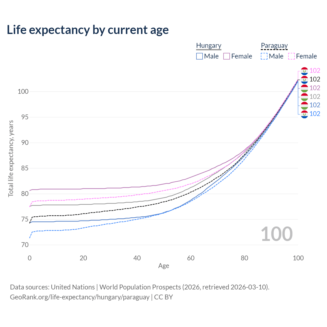 This life expectancy calculator shows the odds of living to 100, 95, 90, and below based on current age for both males and females in Hungary and Paraguay, along with mean and median age of death. The calculations are based on the 2026 life tables (actuarial tables) from the UN World Population Prospects.