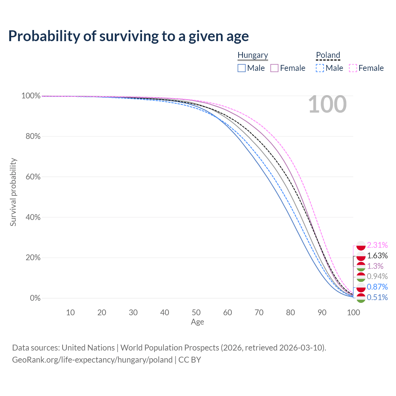 This life expectancy calculator shows the odds of living to 100, 95, 90, and below based on current age for both males and females in Hungary and Poland, along with mean and median age of death. The calculations are based on the 2026 life tables (actuarial tables) from the UN World Population Prospects.