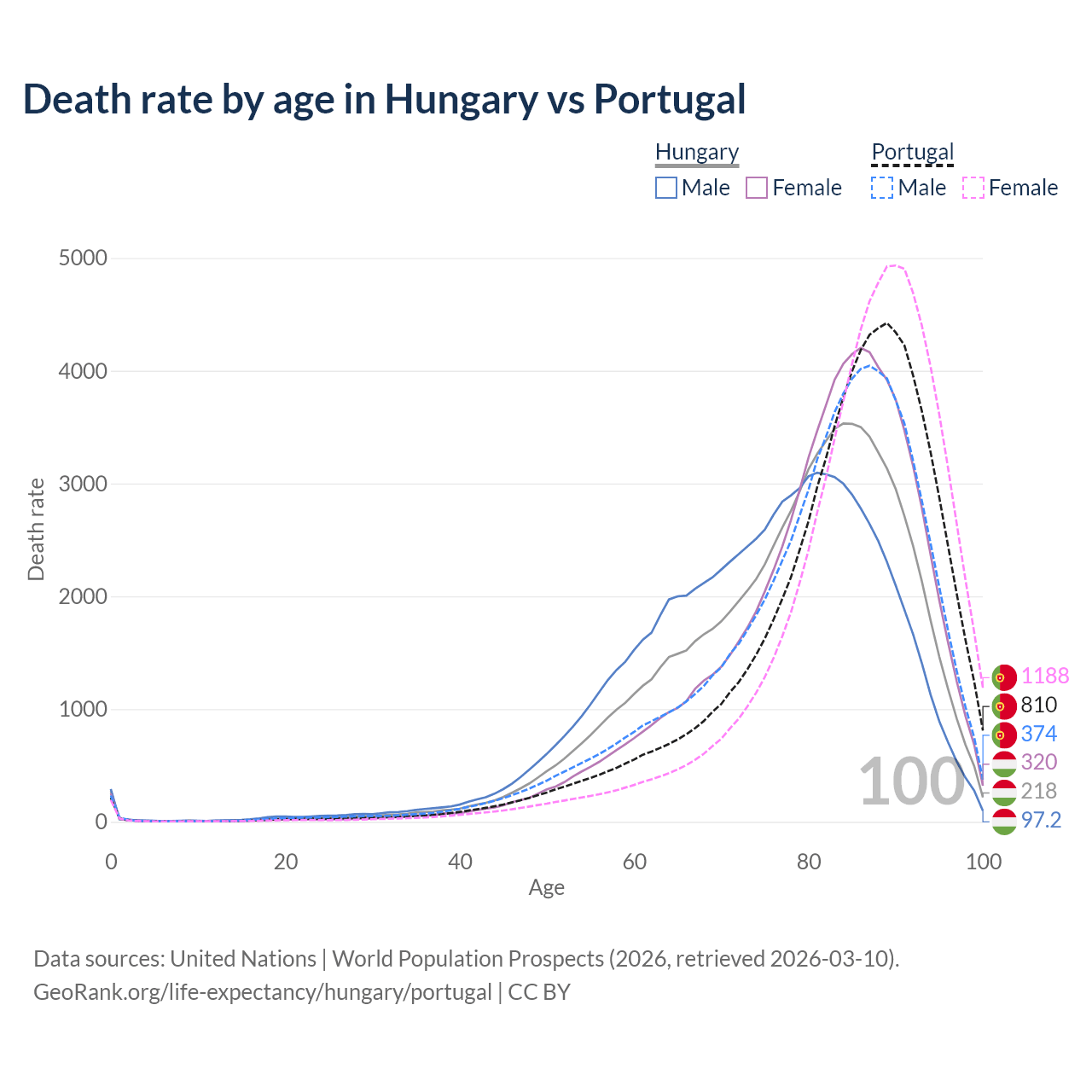 This life expectancy calculator shows the odds of living to 100, 95, 90, and below based on current age for both males and females in Hungary and Portugal, along with mean and median age of death. The calculations are based on the 2026 life tables (actuarial tables) from the UN World Population Prospects.