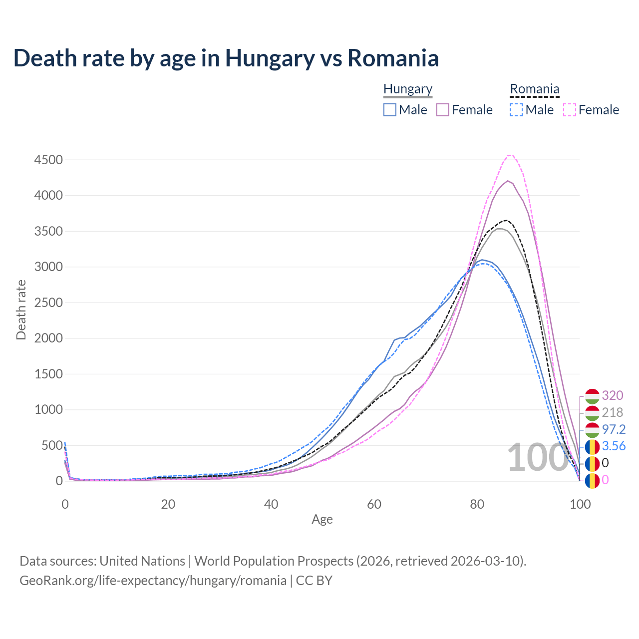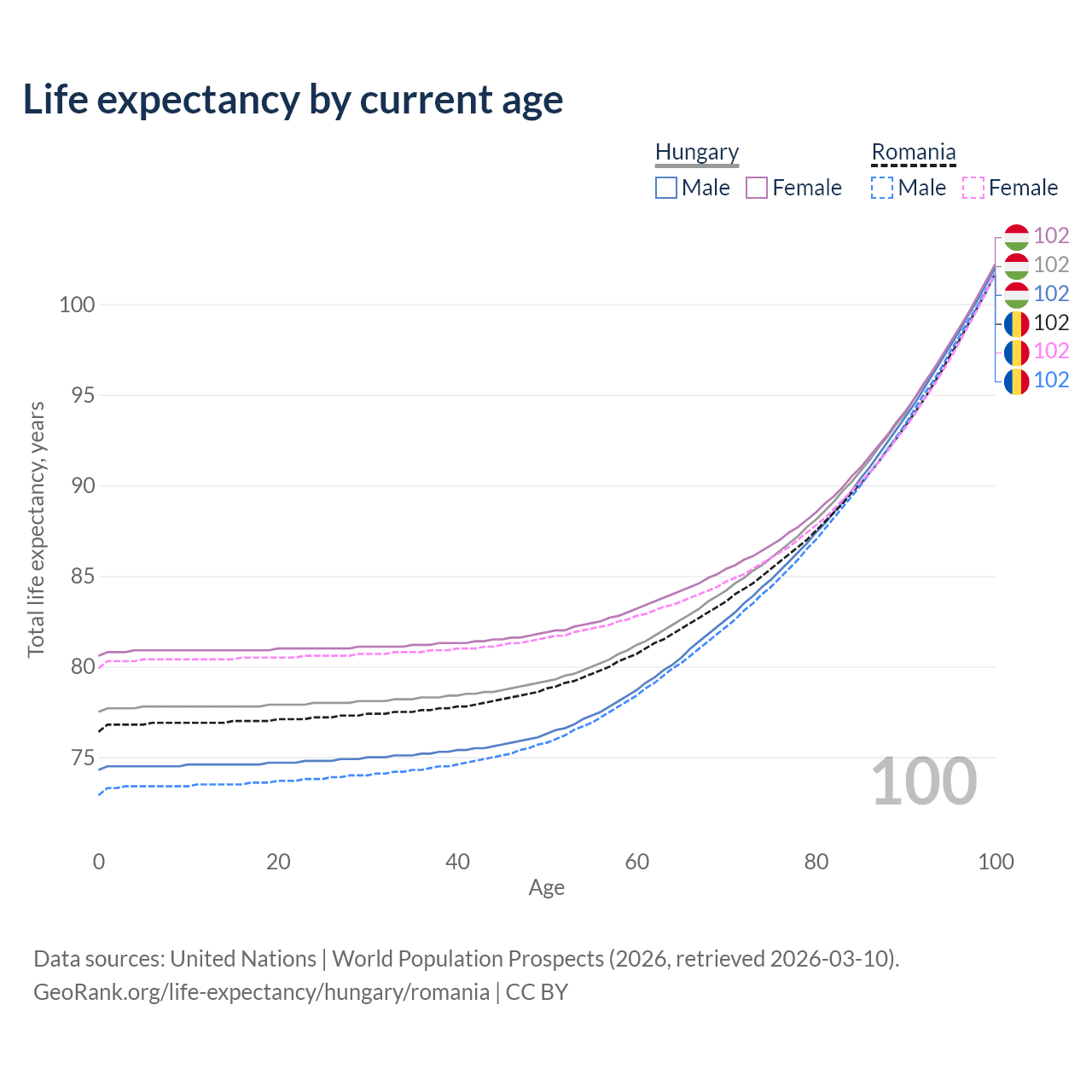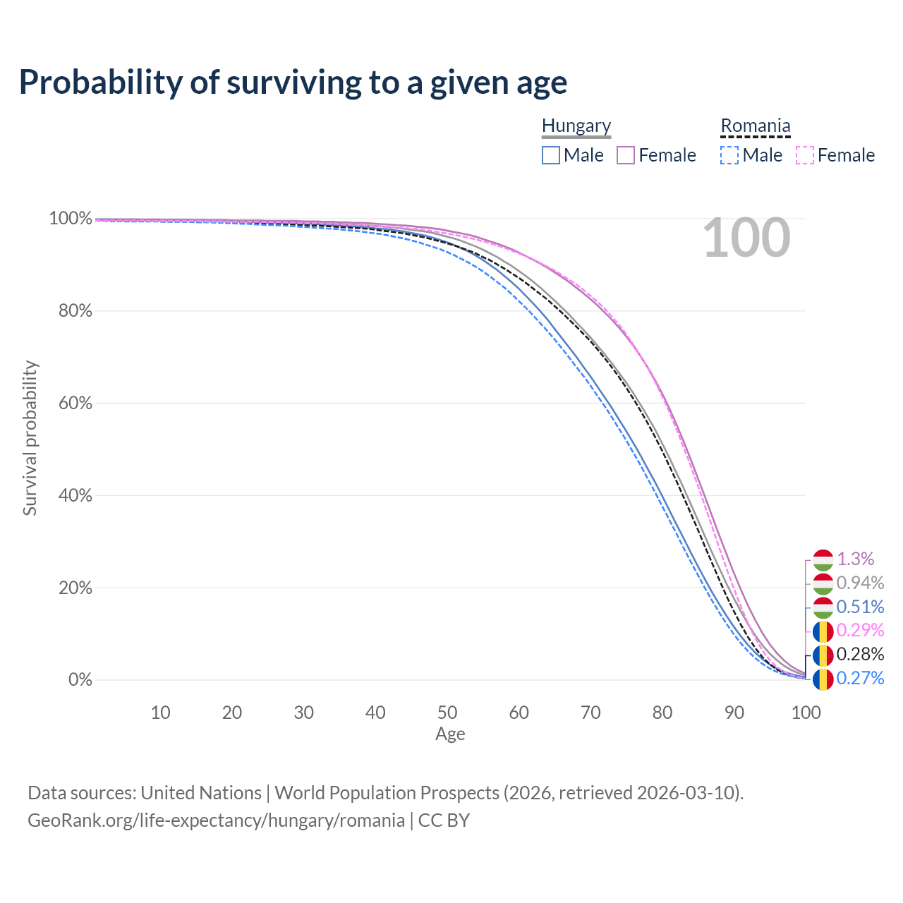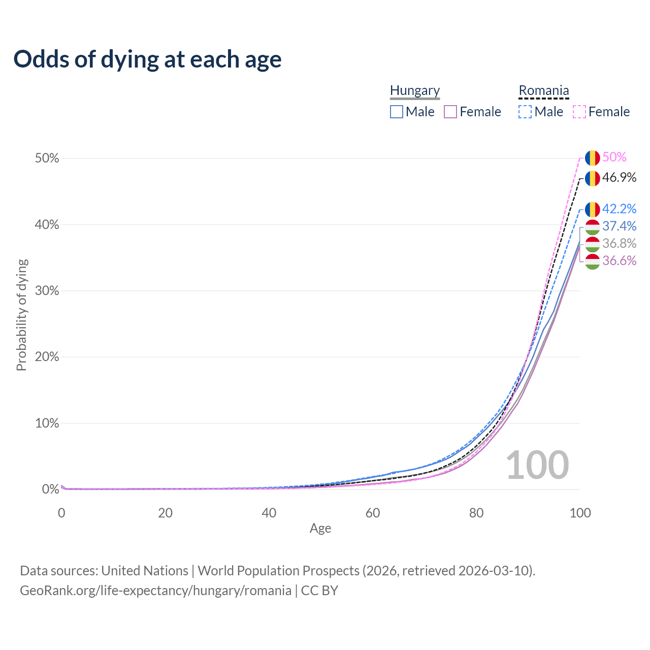 This life expectancy calculator shows the odds of living to 100, 95, 90, and below based on current age for both males and females in Hungary and Romania, along with mean and median age of death. The calculations are based on the 2026 life tables (actuarial tables) from the UN World Population Prospects.
