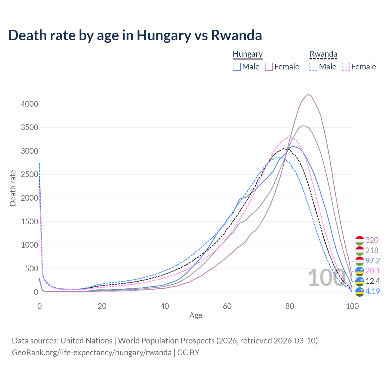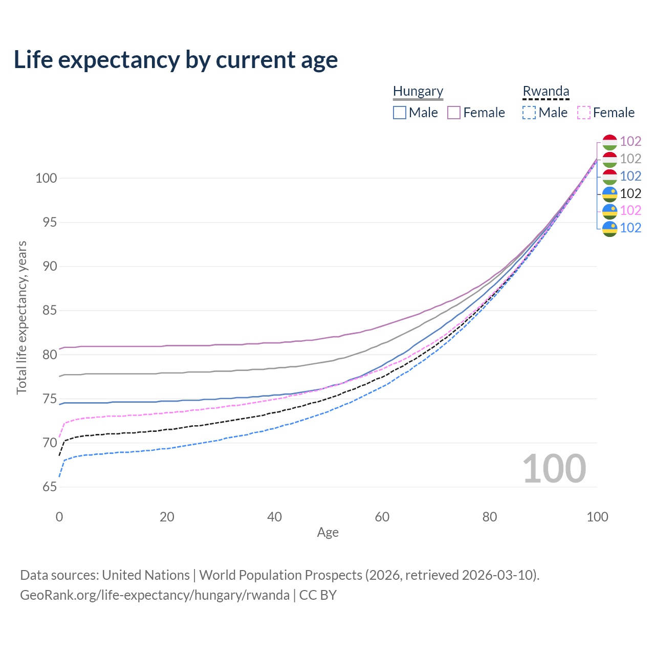This life expectancy calculator shows the odds of living to 100, 95, 90, and below based on current age for both males and females in Hungary and Rwanda, along with mean and median age of death. The calculations are based on the 2026 life tables (actuarial tables) from the UN World Population Prospects.