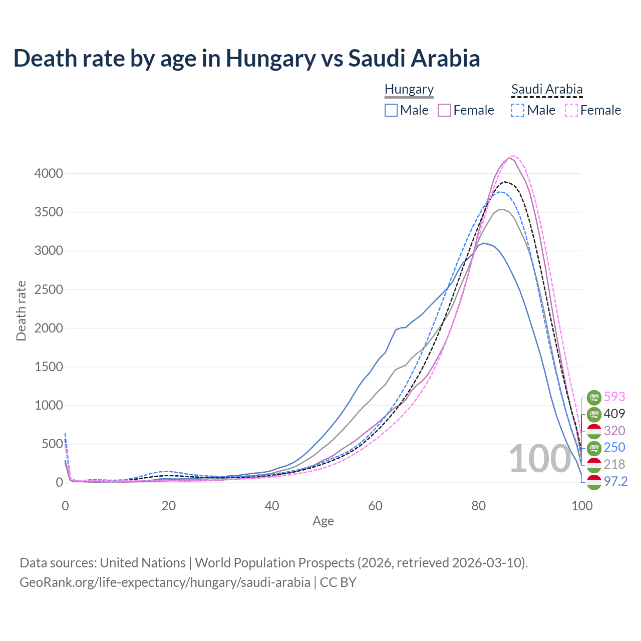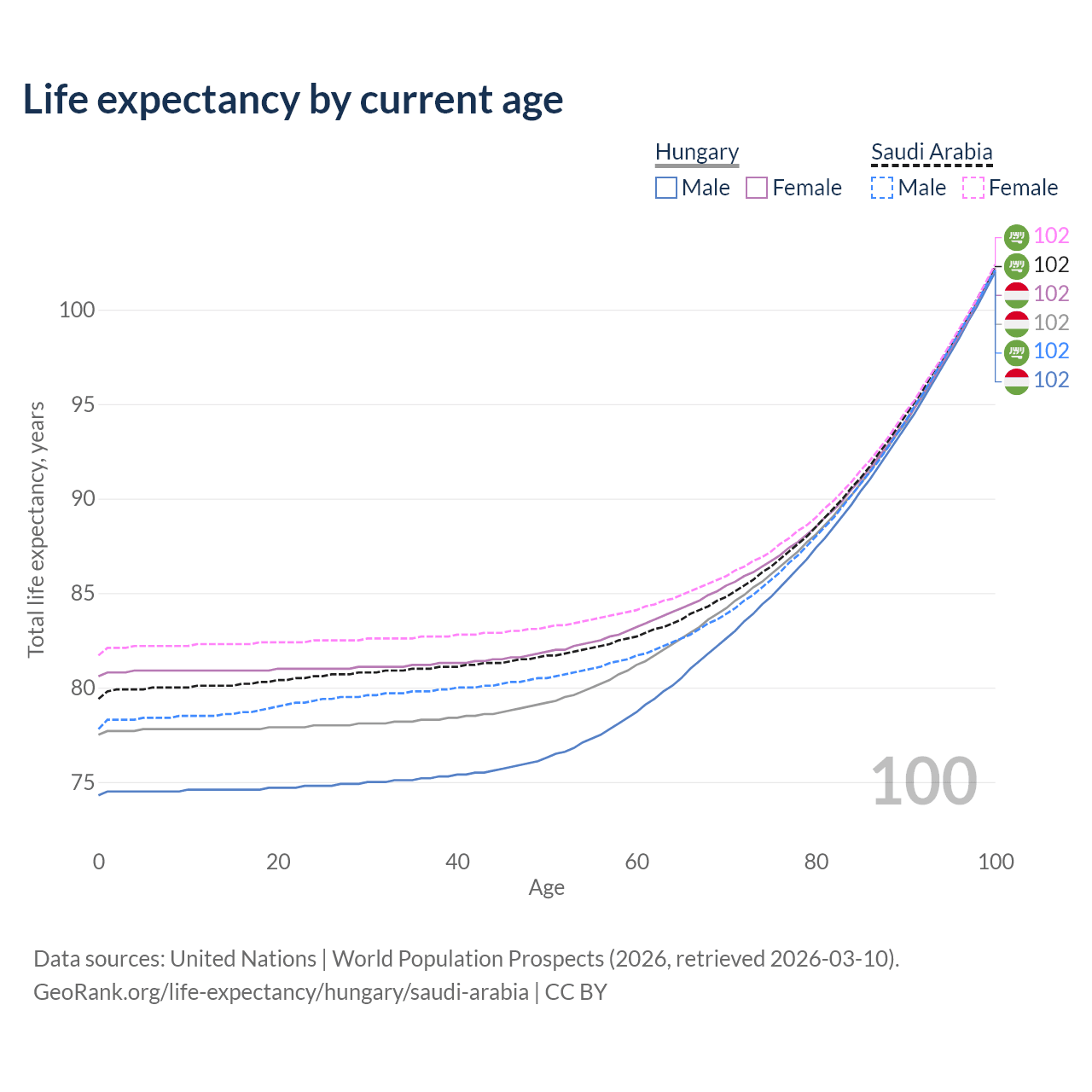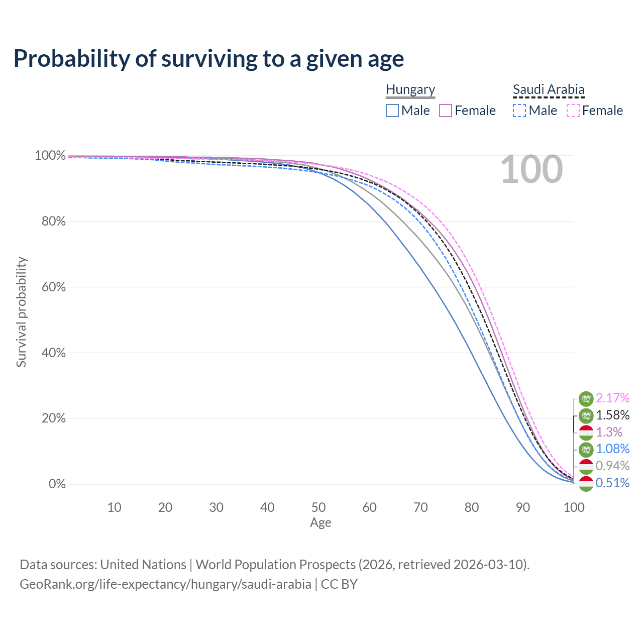 This life expectancy calculator shows the odds of living to 100, 95, 90, and below based on current age for both males and females in Hungary and Saudi Arabia, along with mean and median age of death. The calculations are based on the 2026 life tables (actuarial tables) from the UN World Population Prospects.