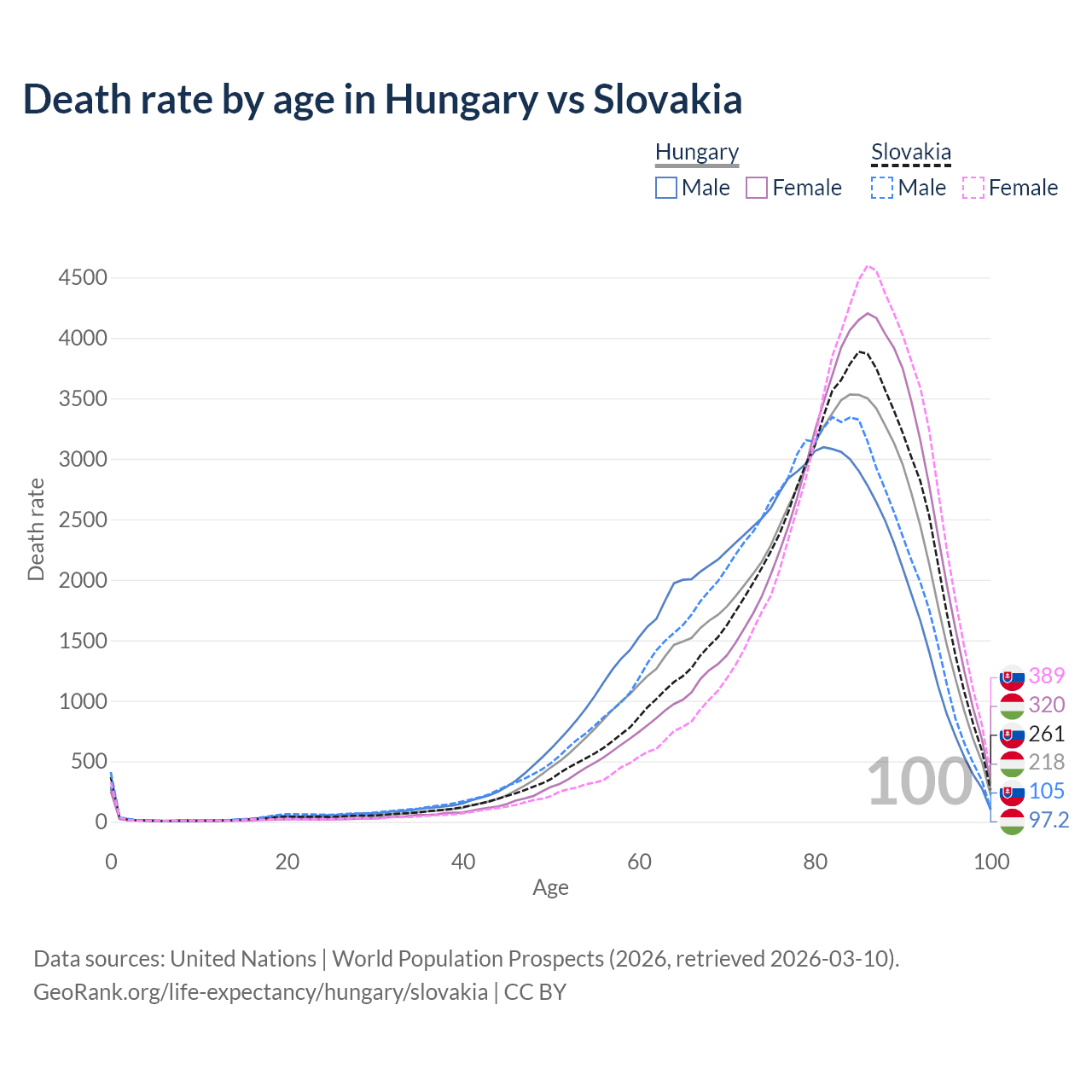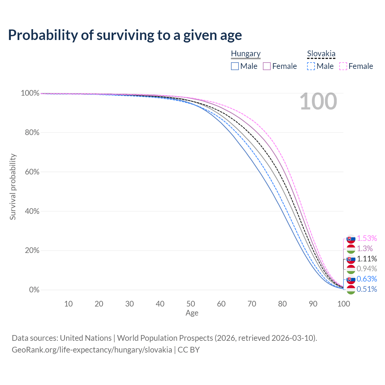 This life expectancy calculator shows the odds of living to 100, 95, 90, and below based on current age for both males and females in Hungary and Slovakia, along with mean and median age of death. The calculations are based on the 2026 life tables (actuarial tables) from the UN World Population Prospects.
