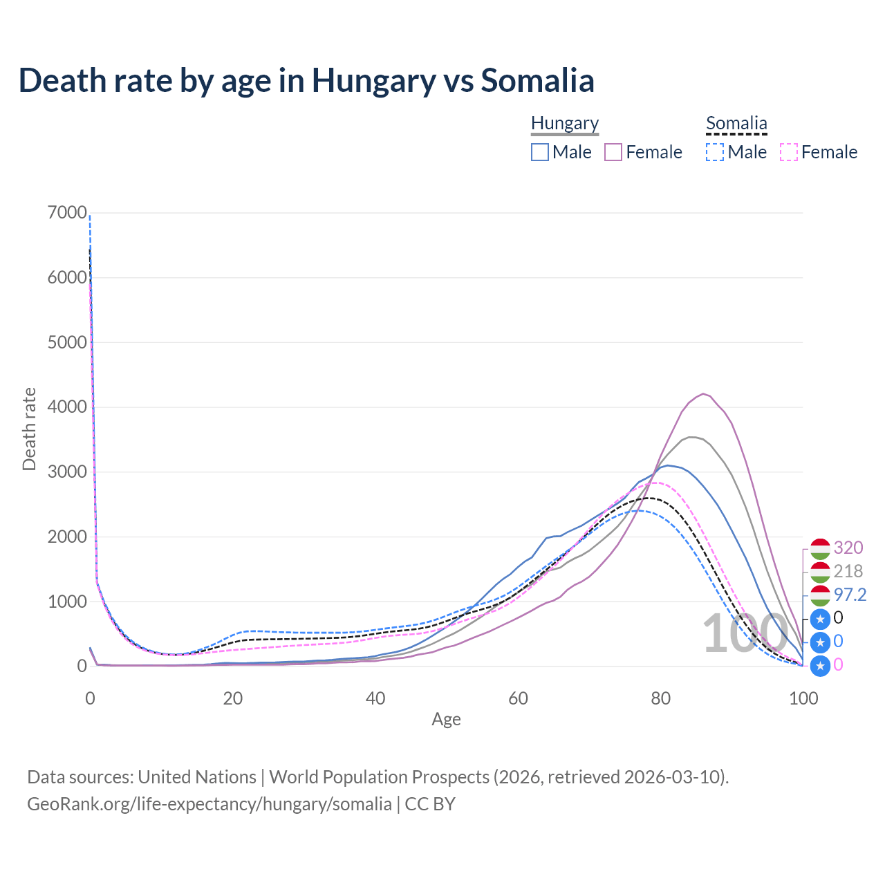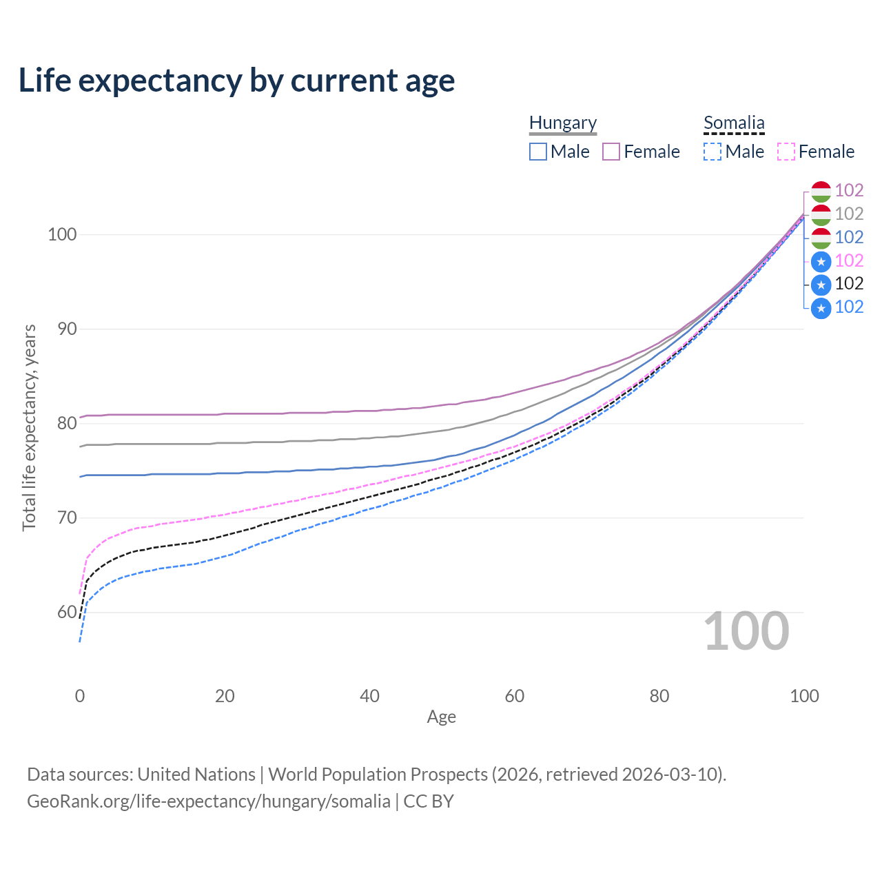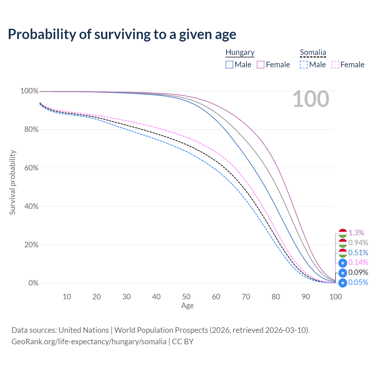 This life expectancy calculator shows the odds of living to 100, 95, 90, and below based on current age for both males and females in Hungary and Somalia, along with mean and median age of death. The calculations are based on the 2026 life tables (actuarial tables) from the UN World Population Prospects.