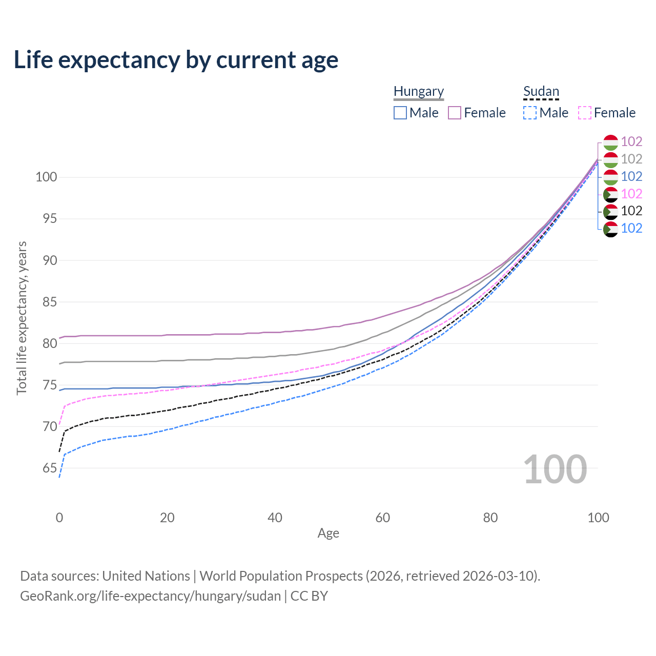 This life expectancy calculator shows the odds of living to 100, 95, 90, and below based on current age for both males and females in Hungary and Sudan, along with mean and median age of death. The calculations are based on the 2026 life tables (actuarial tables) from the UN World Population Prospects.