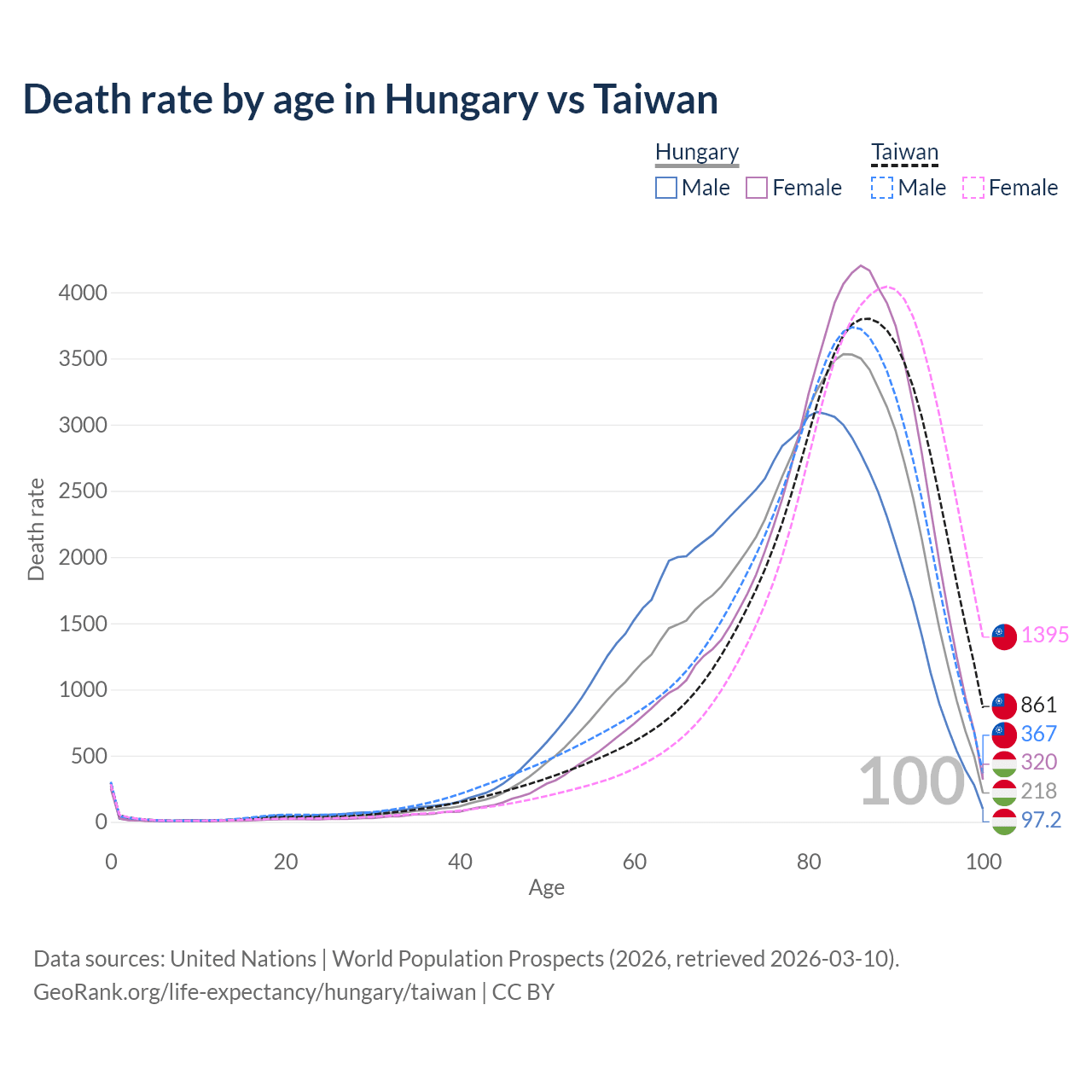 This life expectancy calculator shows the odds of living to 100, 95, 90, and below based on current age for both males and females in Hungary and Taiwan, along with mean and median age of death. The calculations are based on the 2026 life tables (actuarial tables) from the UN World Population Prospects.