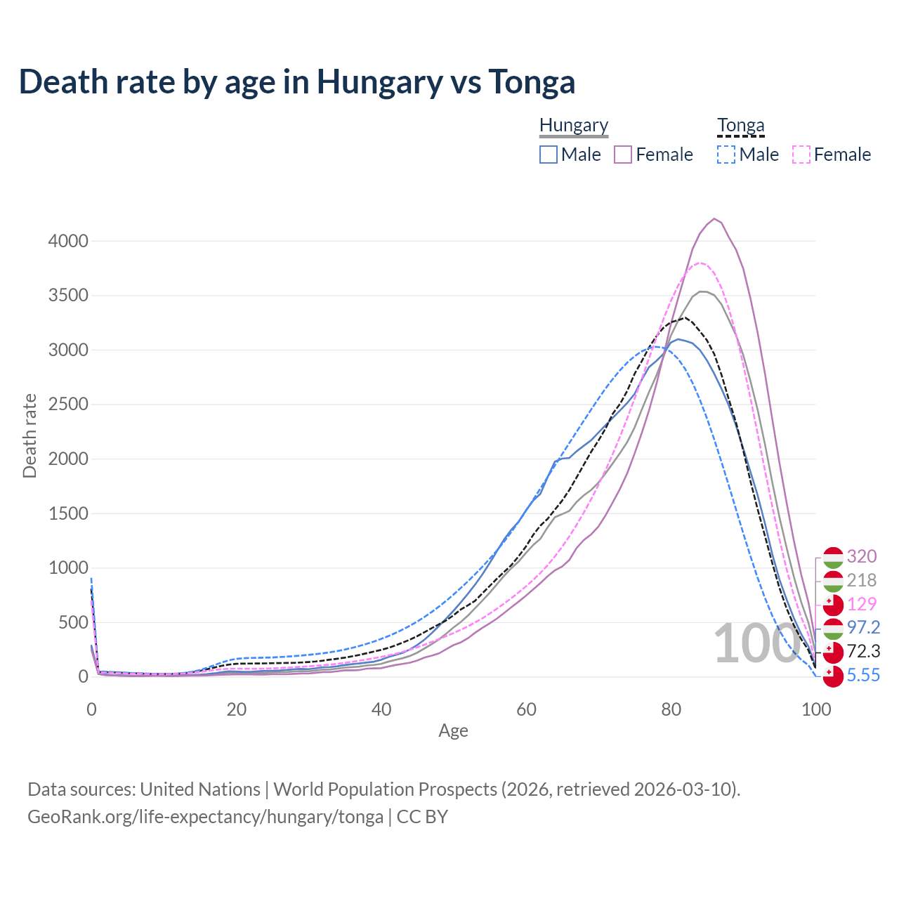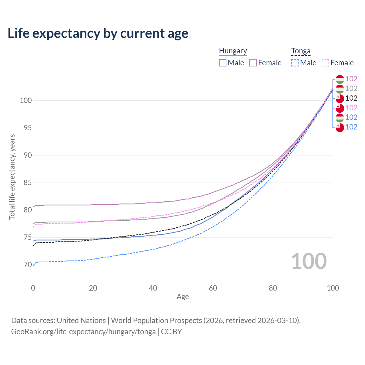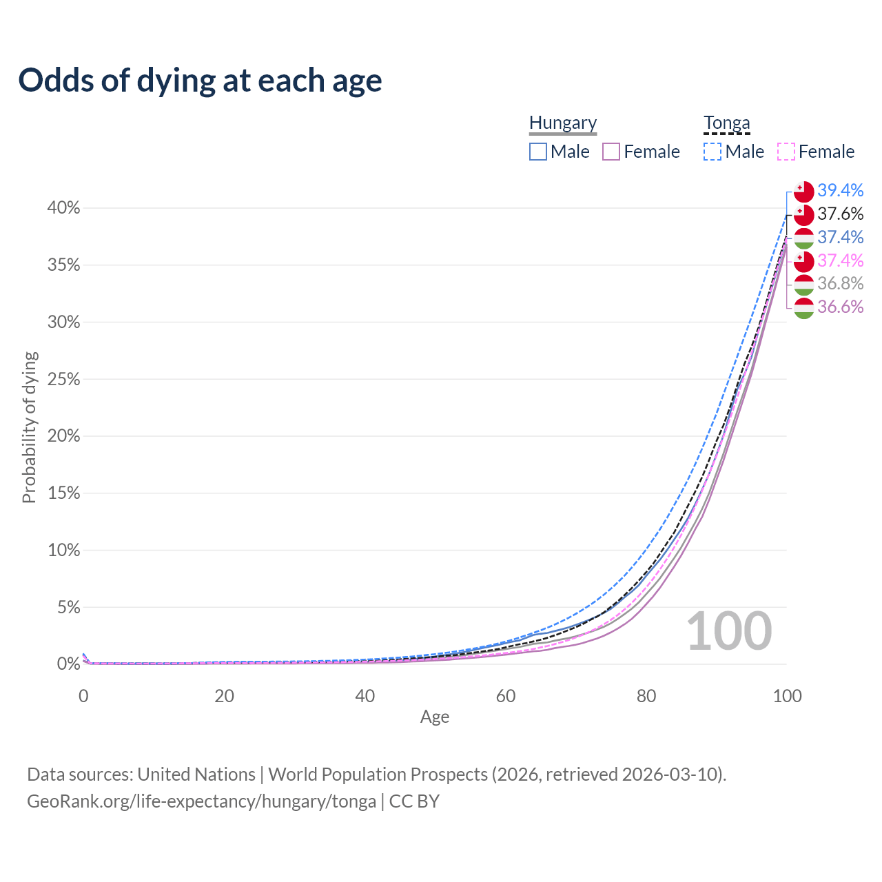 This life expectancy calculator shows the odds of living to 100, 95, 90, and below based on current age for both males and females in Hungary and Tonga, along with mean and median age of death. The calculations are based on the 2026 life tables (actuarial tables) from the UN World Population Prospects.