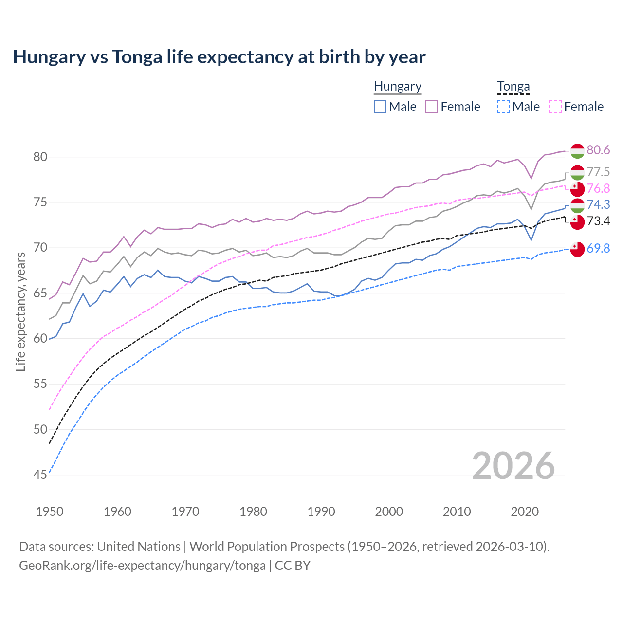 The average life expectancy at birth is 77.5 years in Hungary vs 73.4 in Tonga. Hungary is ranked 69/197 by life expectancy, and Tonga is 109/197. In Hungary, the life expectancy is 74.3 years for males and 80.6 years for females. In Tonga, it's 69.8 years for males and 76.8 years for females.