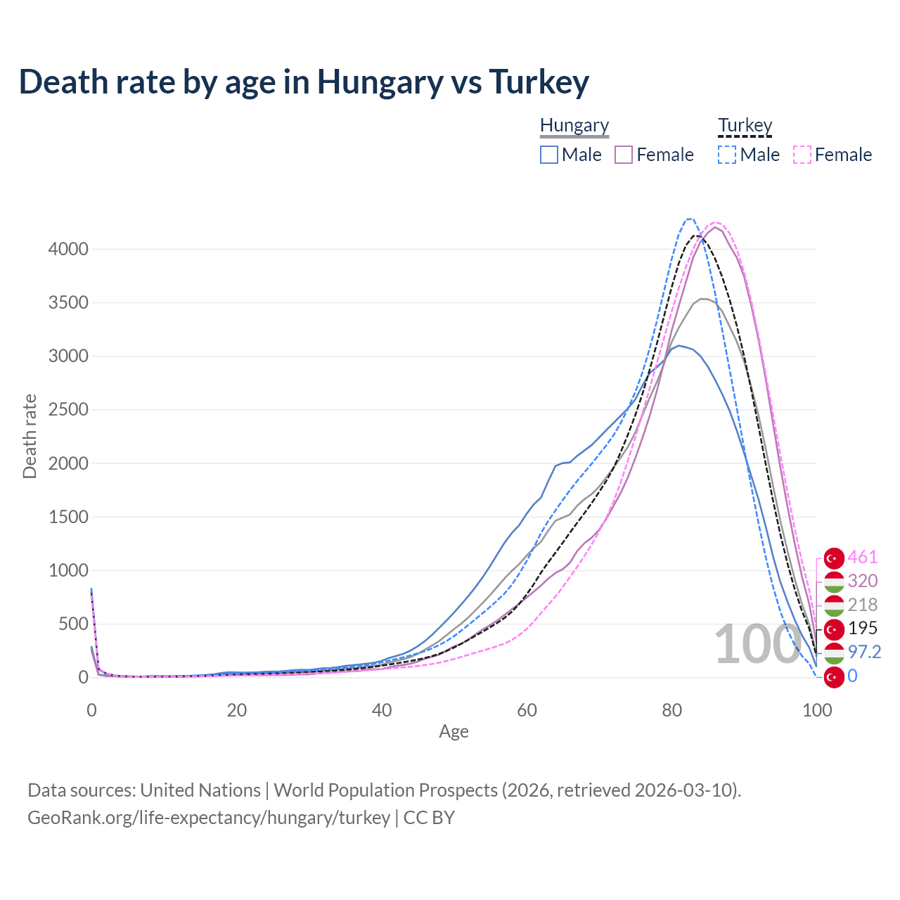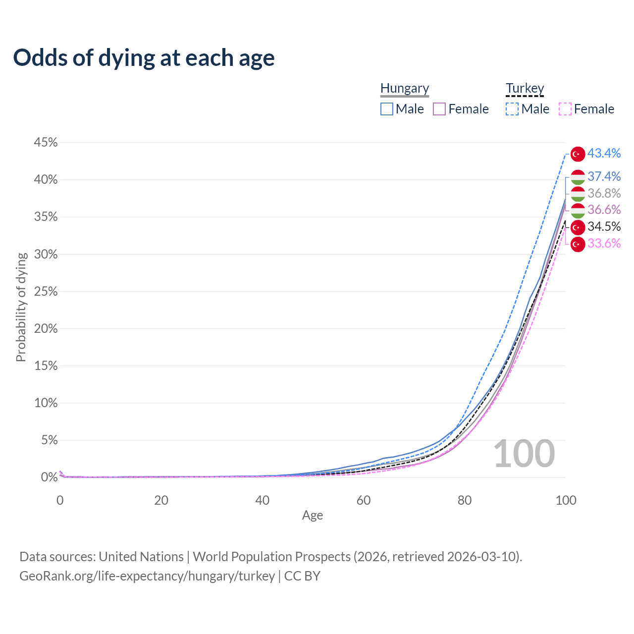 This life expectancy calculator shows the odds of living to 100, 95, 90, and below based on current age for both males and females in Hungary and Turkey, along with mean and median age of death. The calculations are based on the 2026 life tables (actuarial tables) from the UN World Population Prospects.