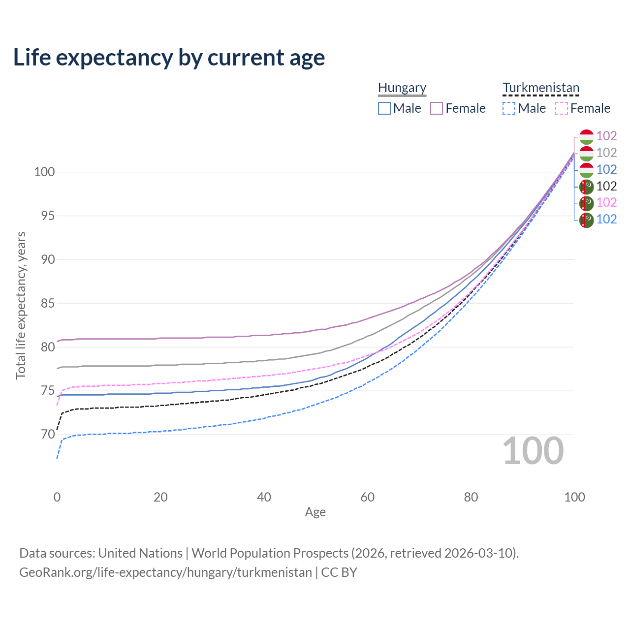 This life expectancy calculator shows the odds of living to 100, 95, 90, and below based on current age for both males and females in Hungary and Turkmenistan, along with mean and median age of death. The calculations are based on the 2026 life tables (actuarial tables) from the UN World Population Prospects.