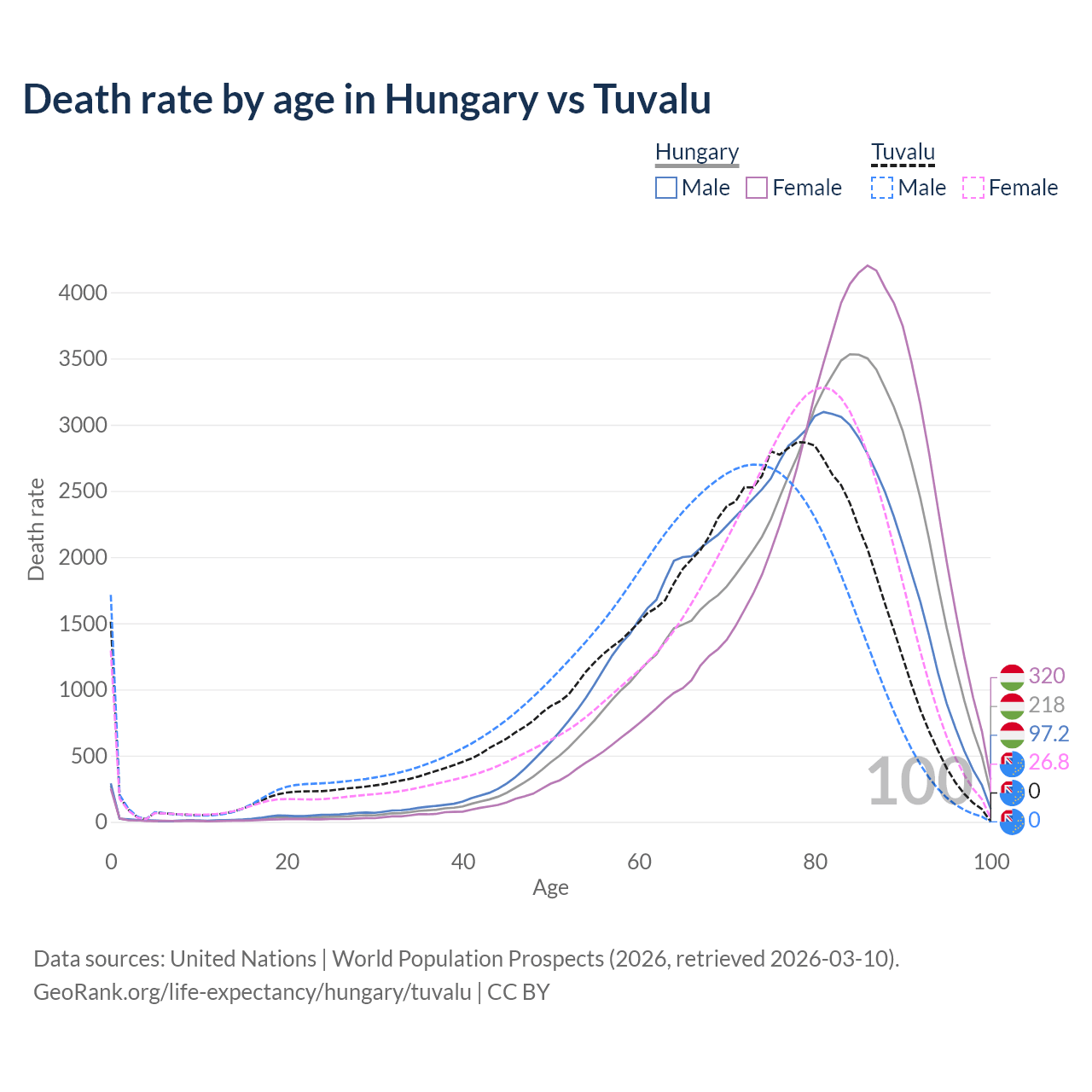 In Hungary, the most common age of death is 84, compared to 78 in Tuvalu. The median age of death is 80.4 in Hungary and 71.9 in Tuvalu, meaning only half of each cohort is expected to live past that age.