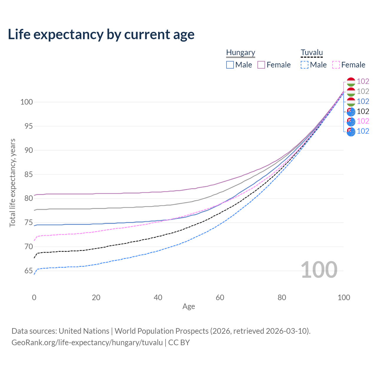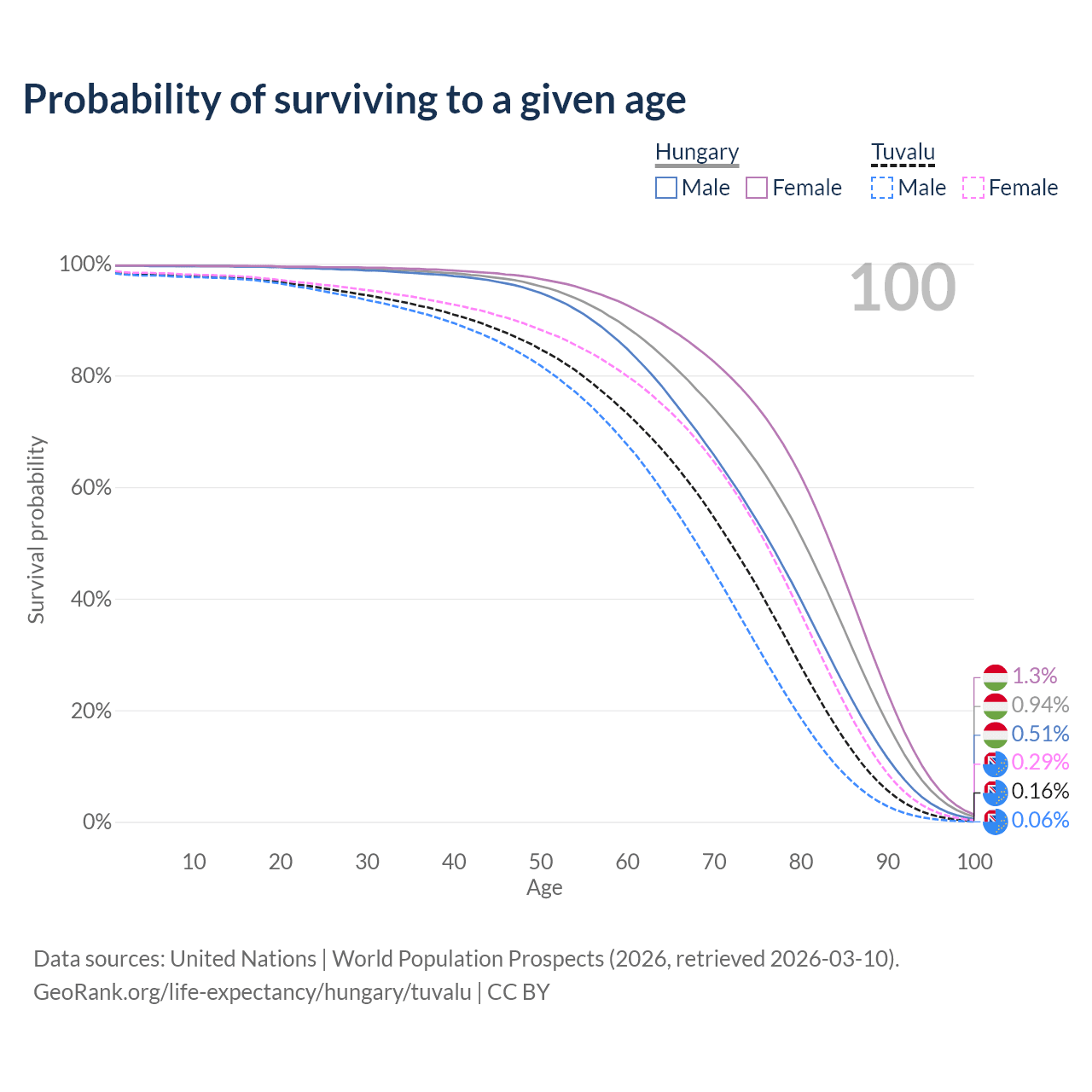 This life expectancy calculator shows the odds of living to 100, 95, 90, and below based on current age for both males and females in Hungary and Tuvalu, along with mean and median age of death. The calculations are based on the 2026 life tables (actuarial tables) from the UN World Population Prospects.