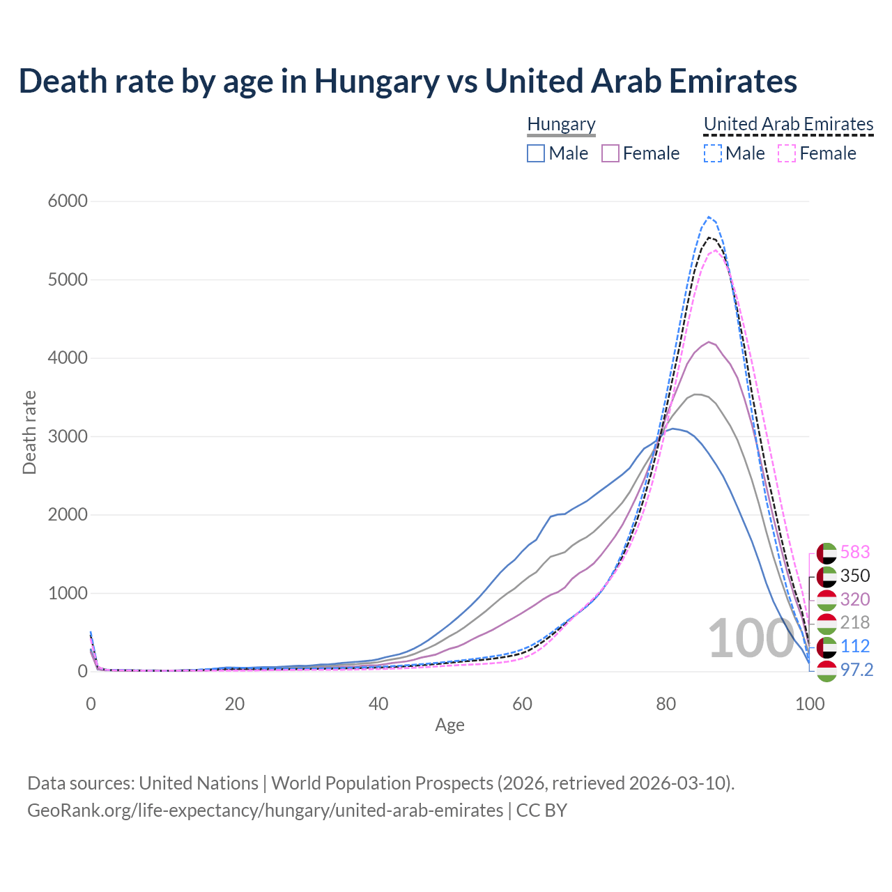 This life expectancy calculator shows the odds of living to 100, 95, 90, and below based on current age for both males and females in Hungary and the United Arab Emirates, along with mean and median age of death. The calculations are based on the 2026 life tables (actuarial tables) from the UN World Population Prospects.