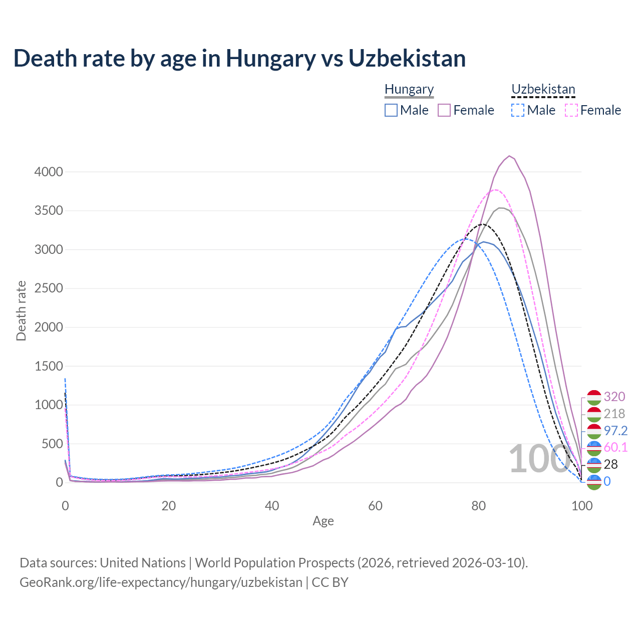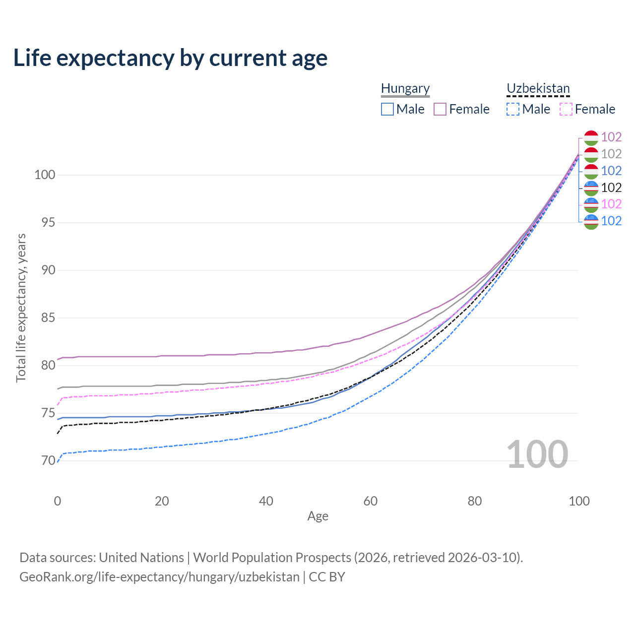 This life expectancy calculator shows the odds of living to 100, 95, 90, and below based on current age for both males and females in Hungary and Uzbekistan, along with mean and median age of death. The calculations are based on the 2026 life tables (actuarial tables) from the UN World Population Prospects.