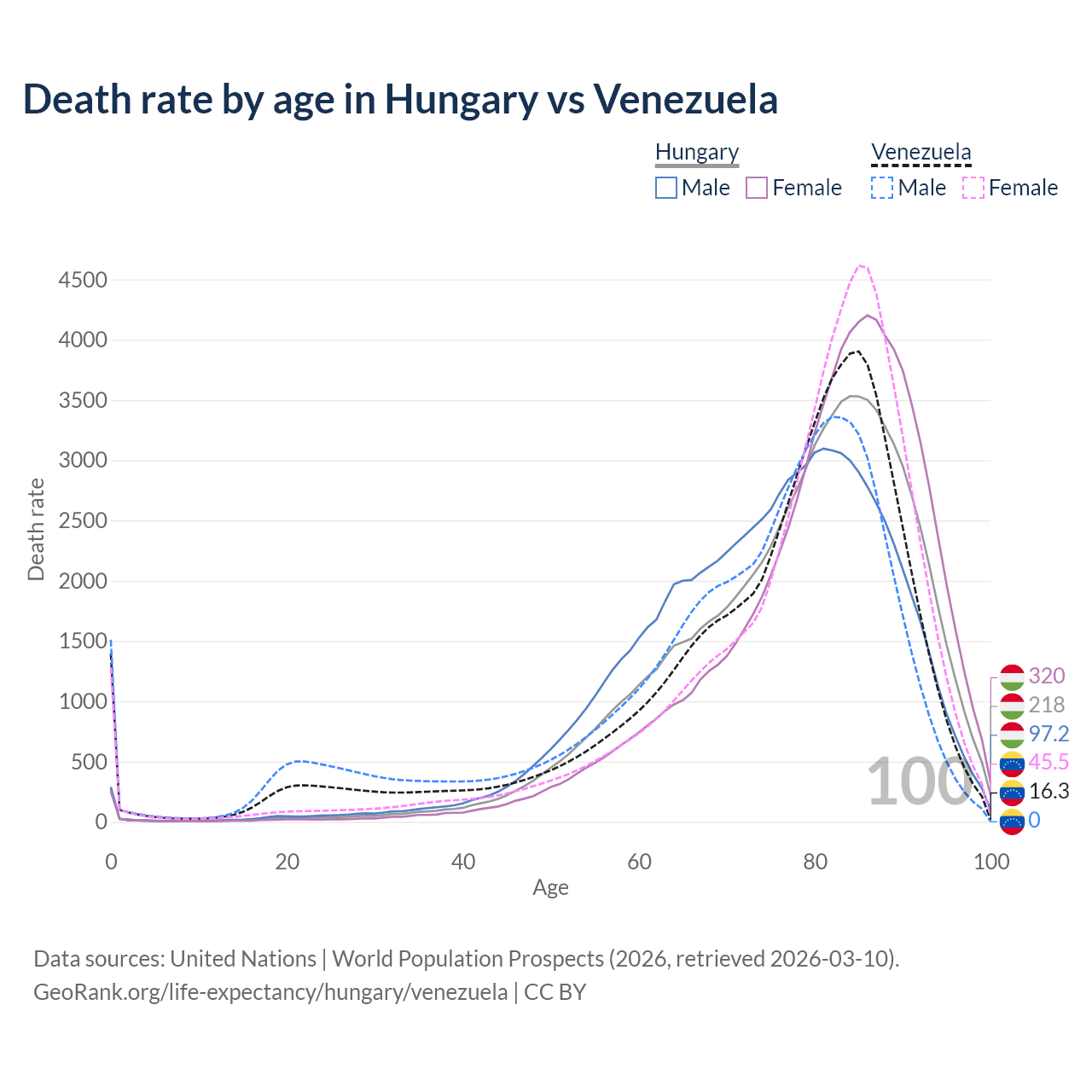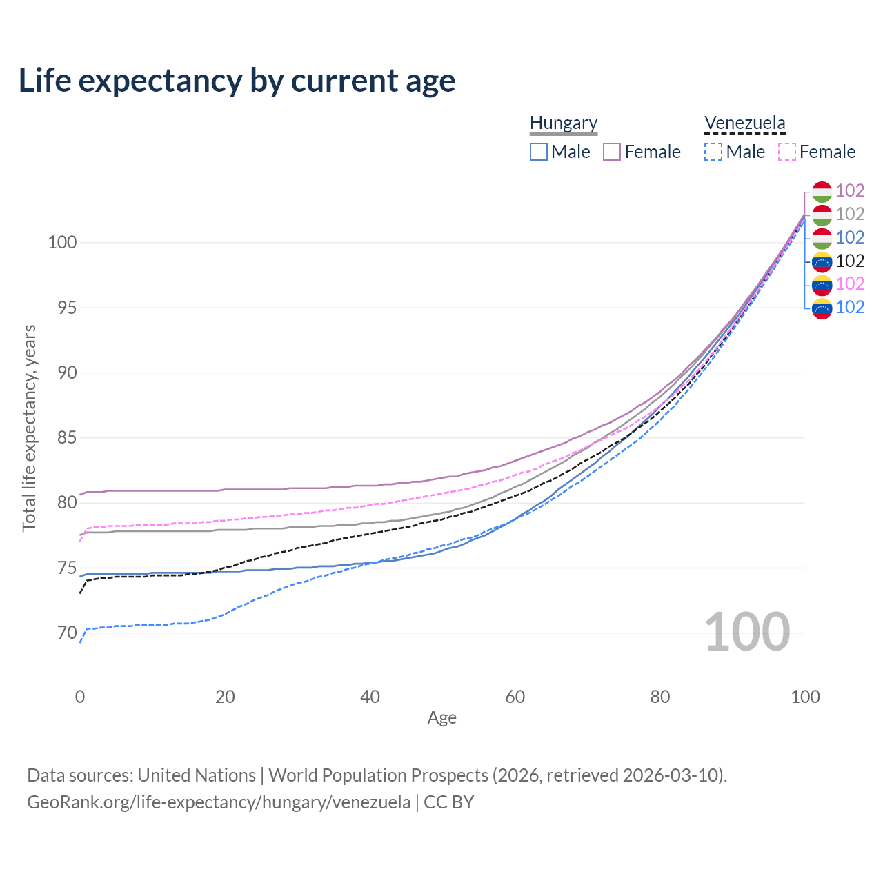 This life expectancy calculator shows the odds of living to 100, 95, 90, and below based on current age for both males and females in Hungary and Venezuela, along with mean and median age of death. The calculations are based on the 2026 life tables (actuarial tables) from the UN World Population Prospects.