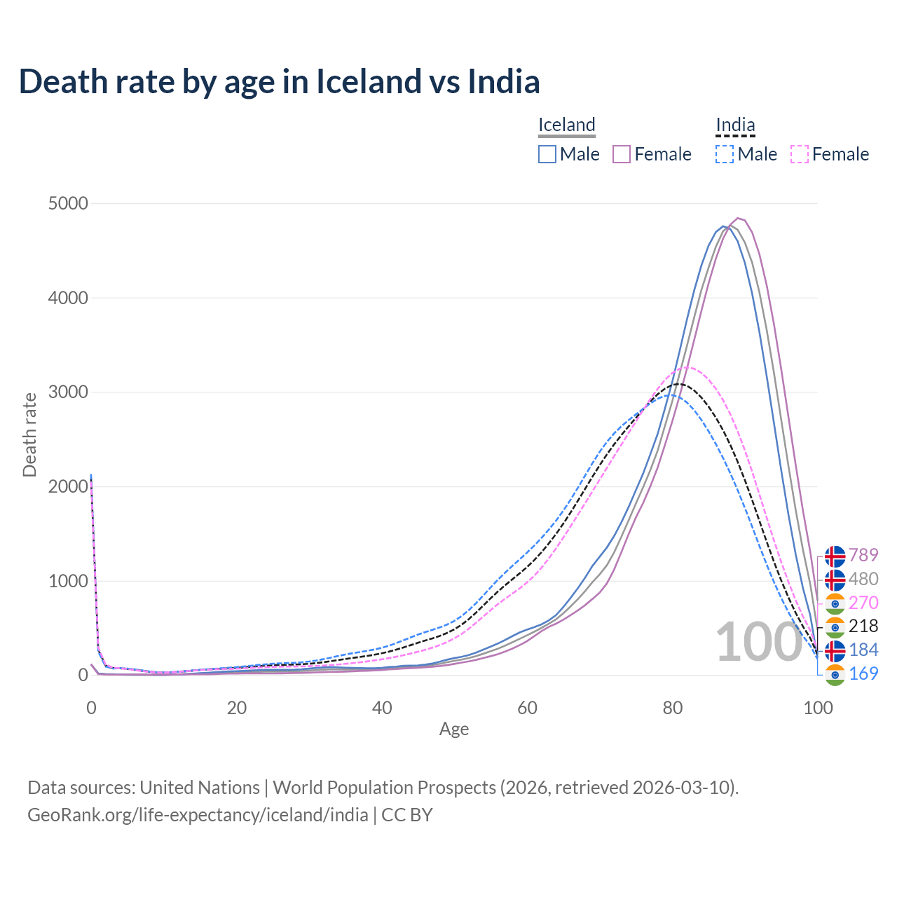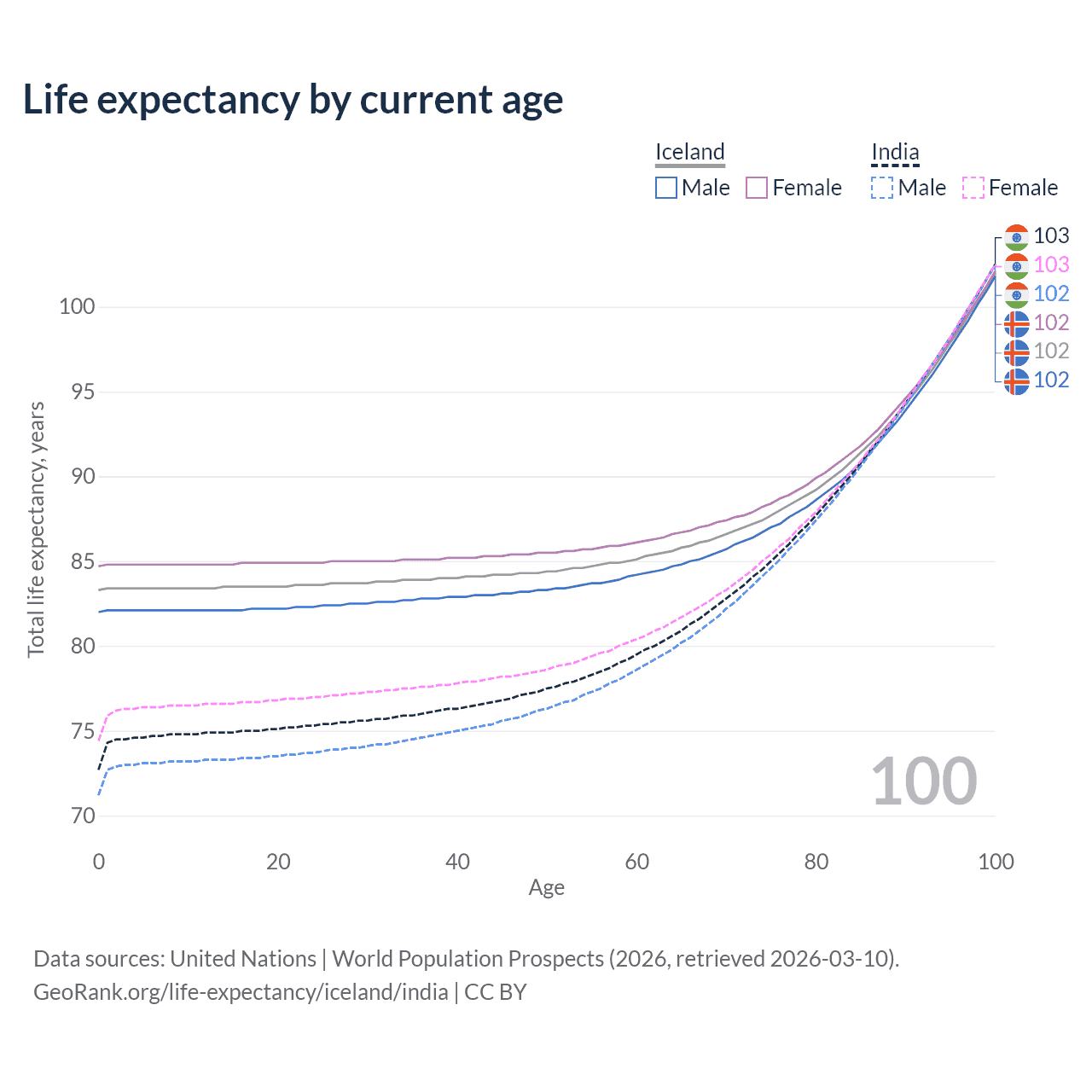 This life expectancy calculator shows the odds of living to 100, 95, 90, and below based on current age for both males and females in Iceland and India, along with mean and median age of death. The calculations are based on the 2026 life tables (actuarial tables) from the UN World Population Prospects.