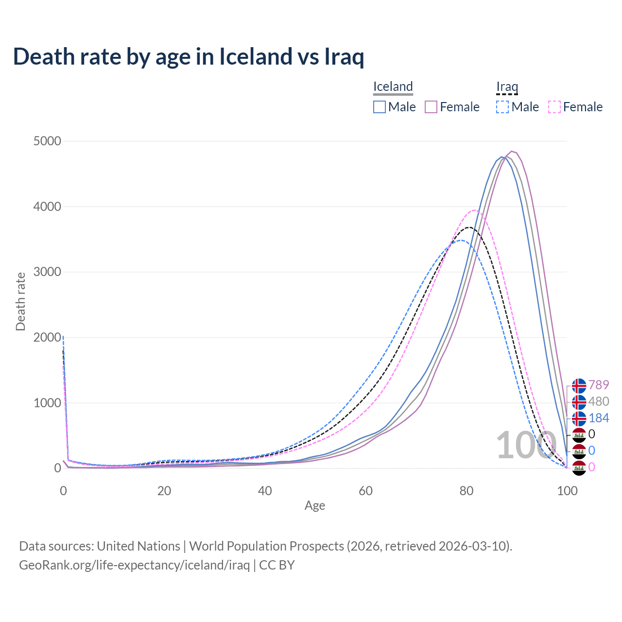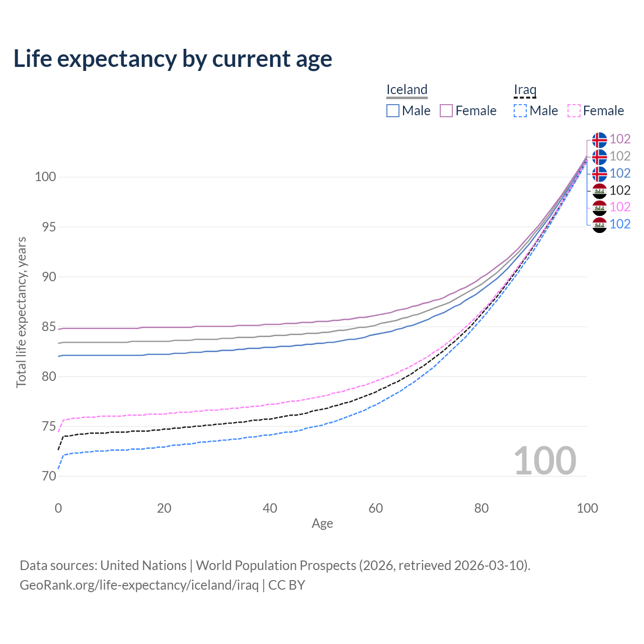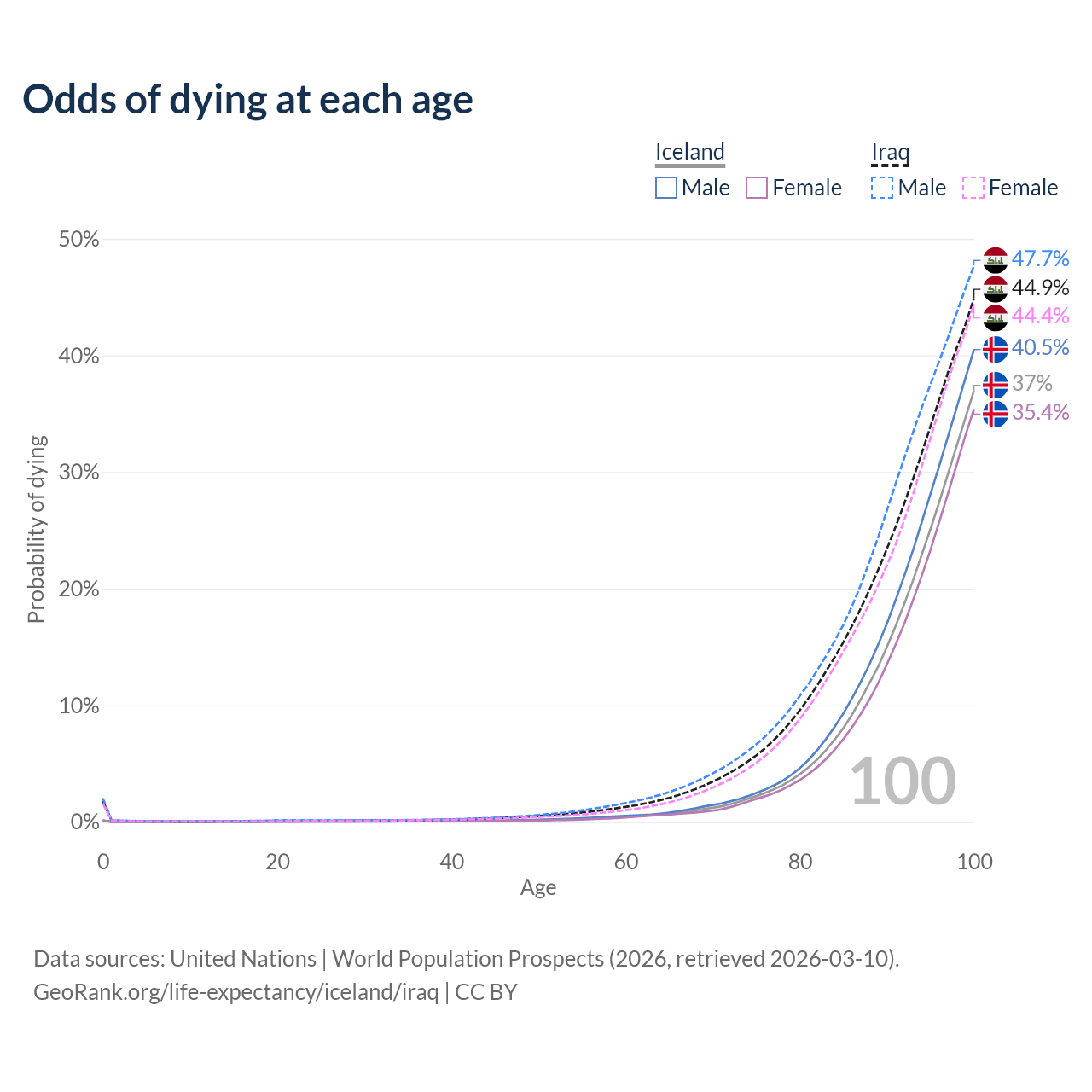 This life expectancy calculator shows the odds of living to 100, 95, 90, and below based on current age for both males and females in Iceland and Iraq, along with mean and median age of death. The calculations are based on the 2026 life tables (actuarial tables) from the UN World Population Prospects.