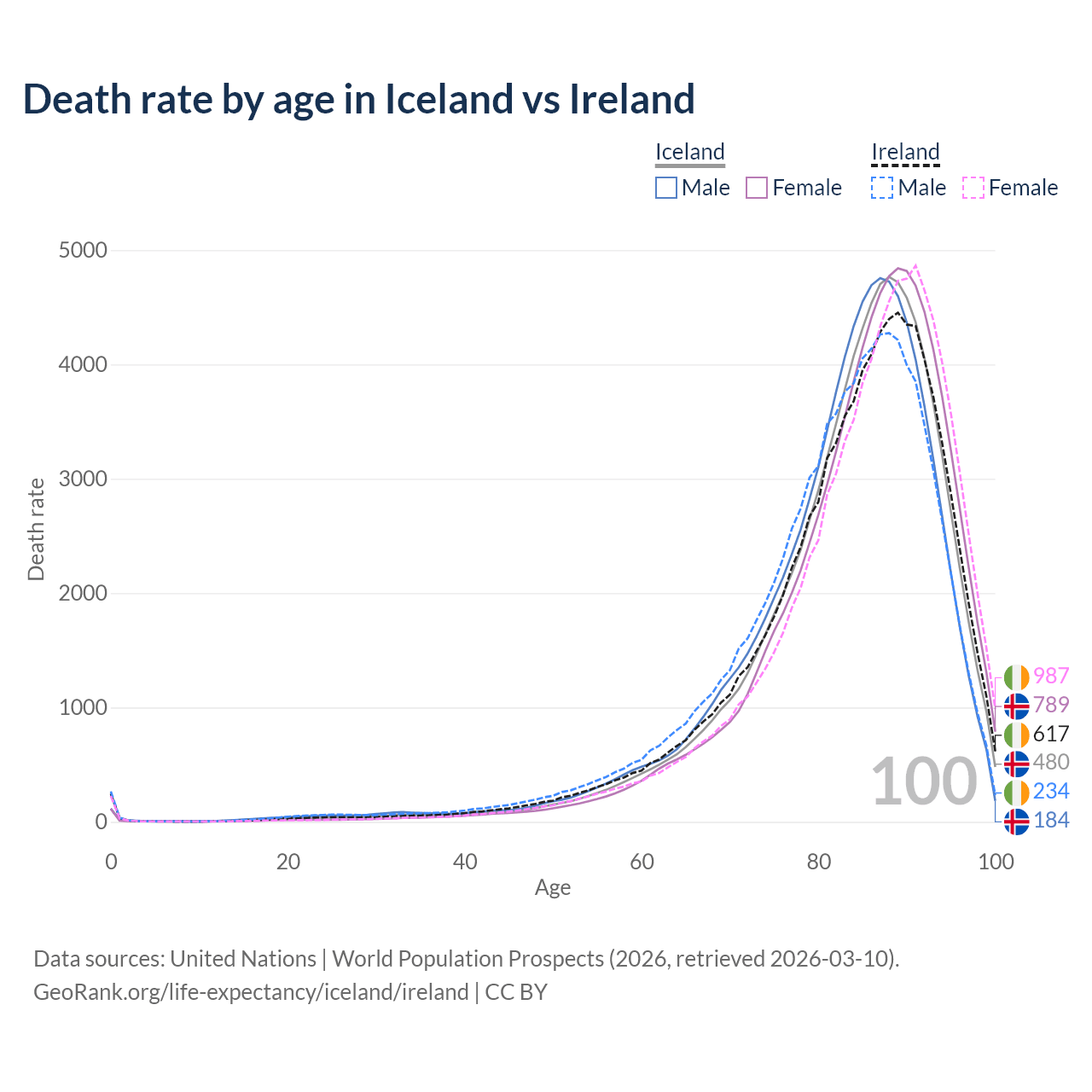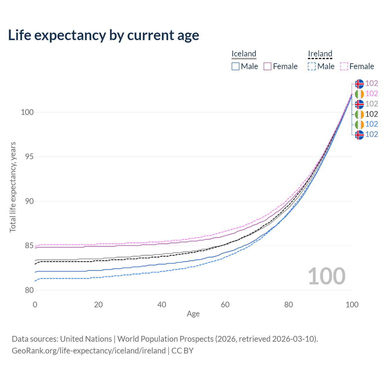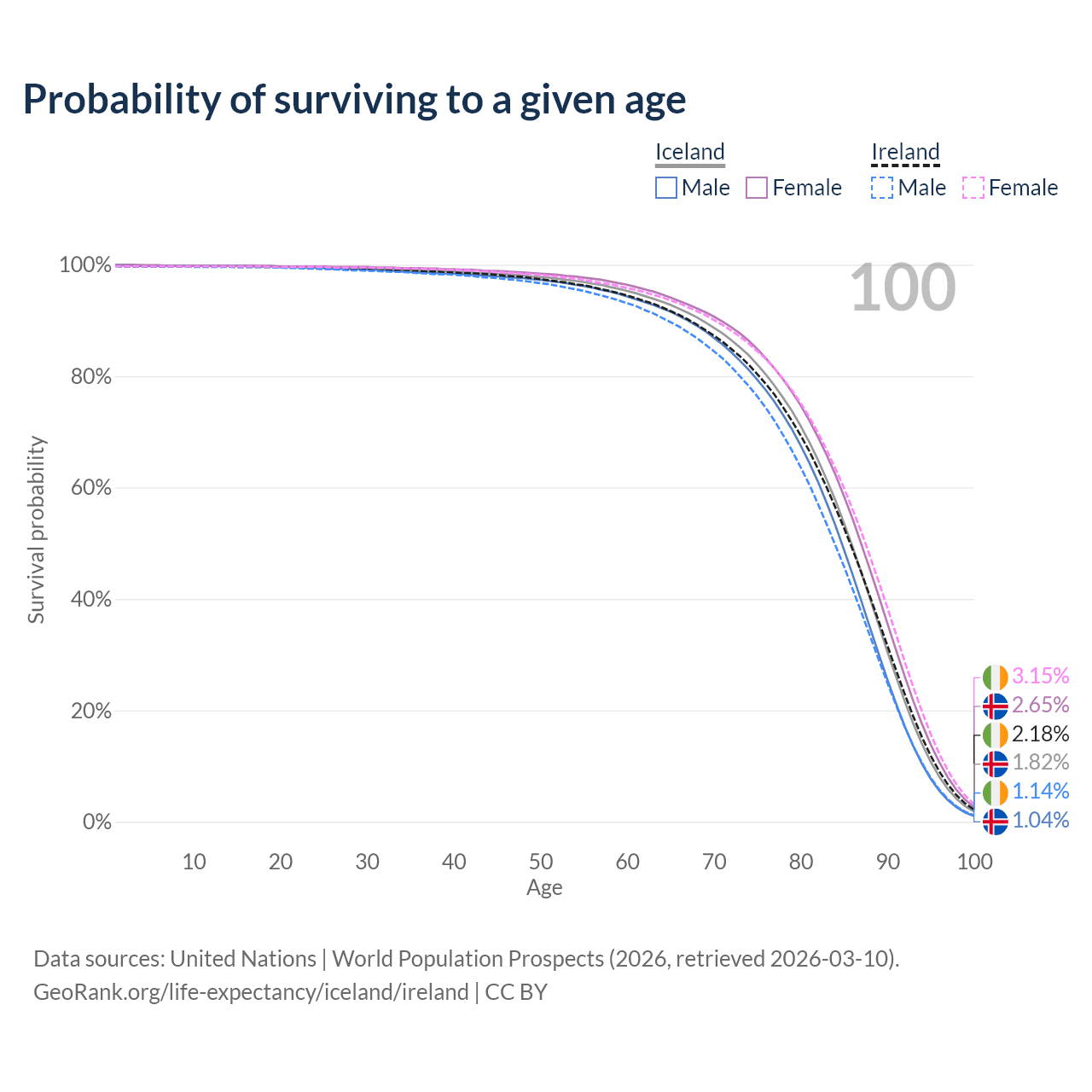 This life expectancy calculator shows the odds of living to 100, 95, 90, and below based on current age for both males and females in Iceland and Ireland, along with mean and median age of death. The calculations are based on the 2026 life tables (actuarial tables) from the UN World Population Prospects.