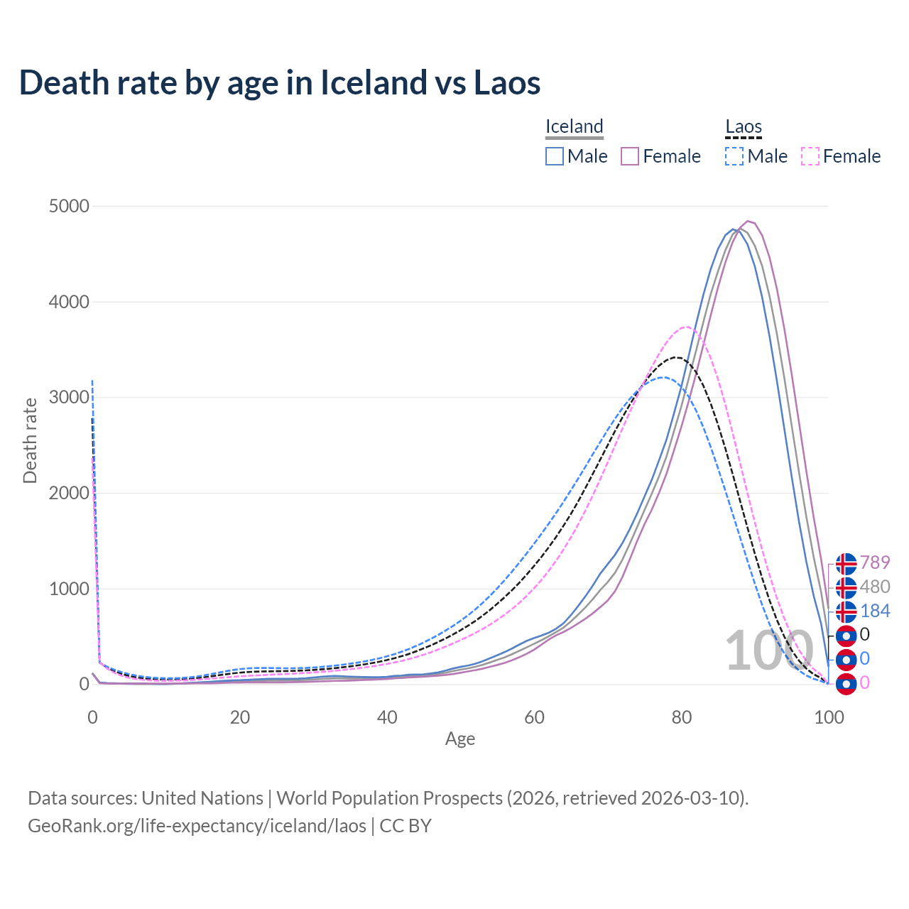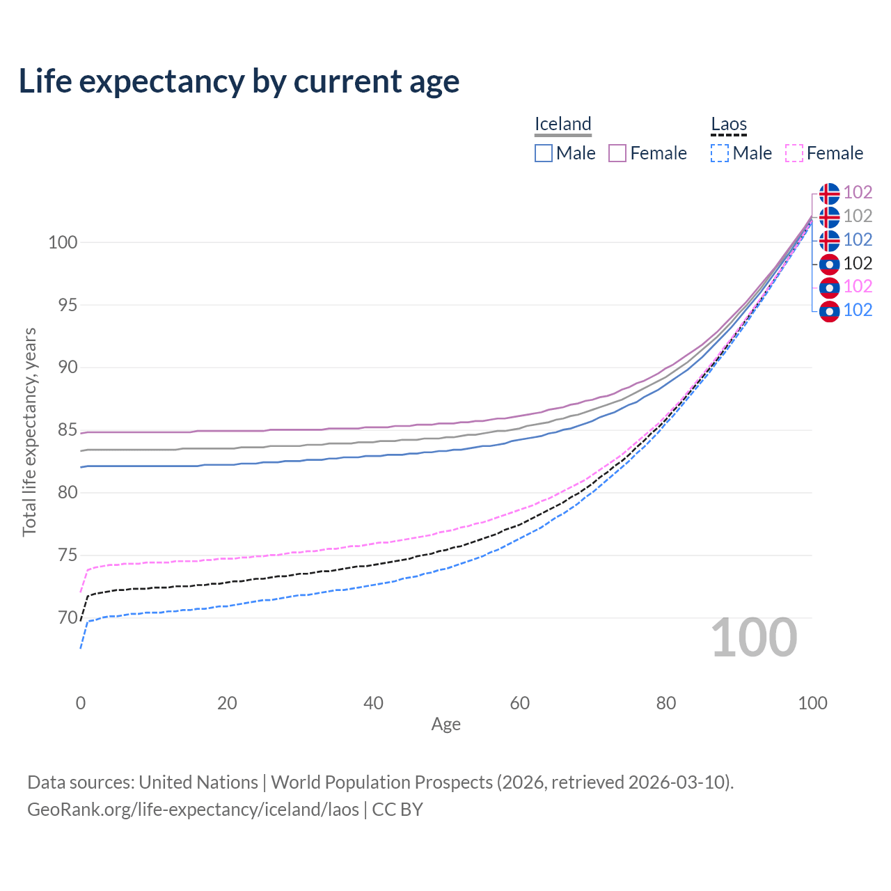 This life expectancy calculator shows the odds of living to 100, 95, 90, and below based on current age for both males and females in Iceland and Laos, along with mean and median age of death. The calculations are based on the 2026 life tables (actuarial tables) from the UN World Population Prospects.