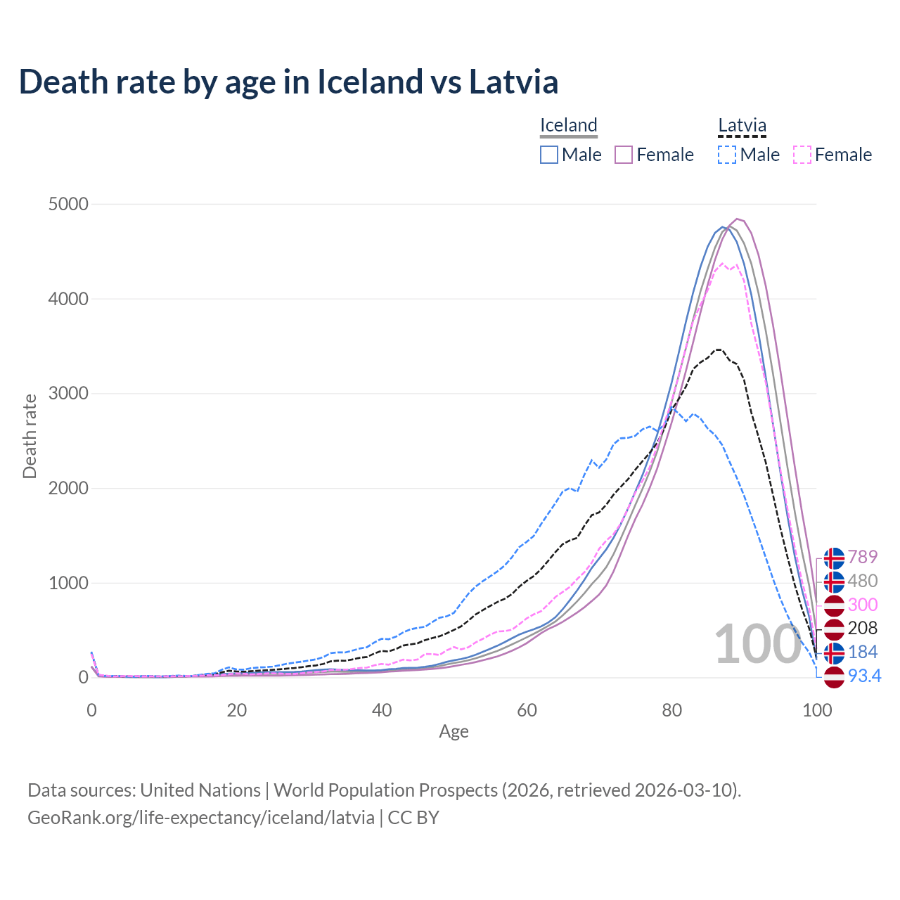 This life expectancy calculator shows the odds of living to 100, 95, 90, and below based on current age for both males and females in Iceland and Latvia, along with mean and median age of death. The calculations are based on the 2026 life tables (actuarial tables) from the UN World Population Prospects.