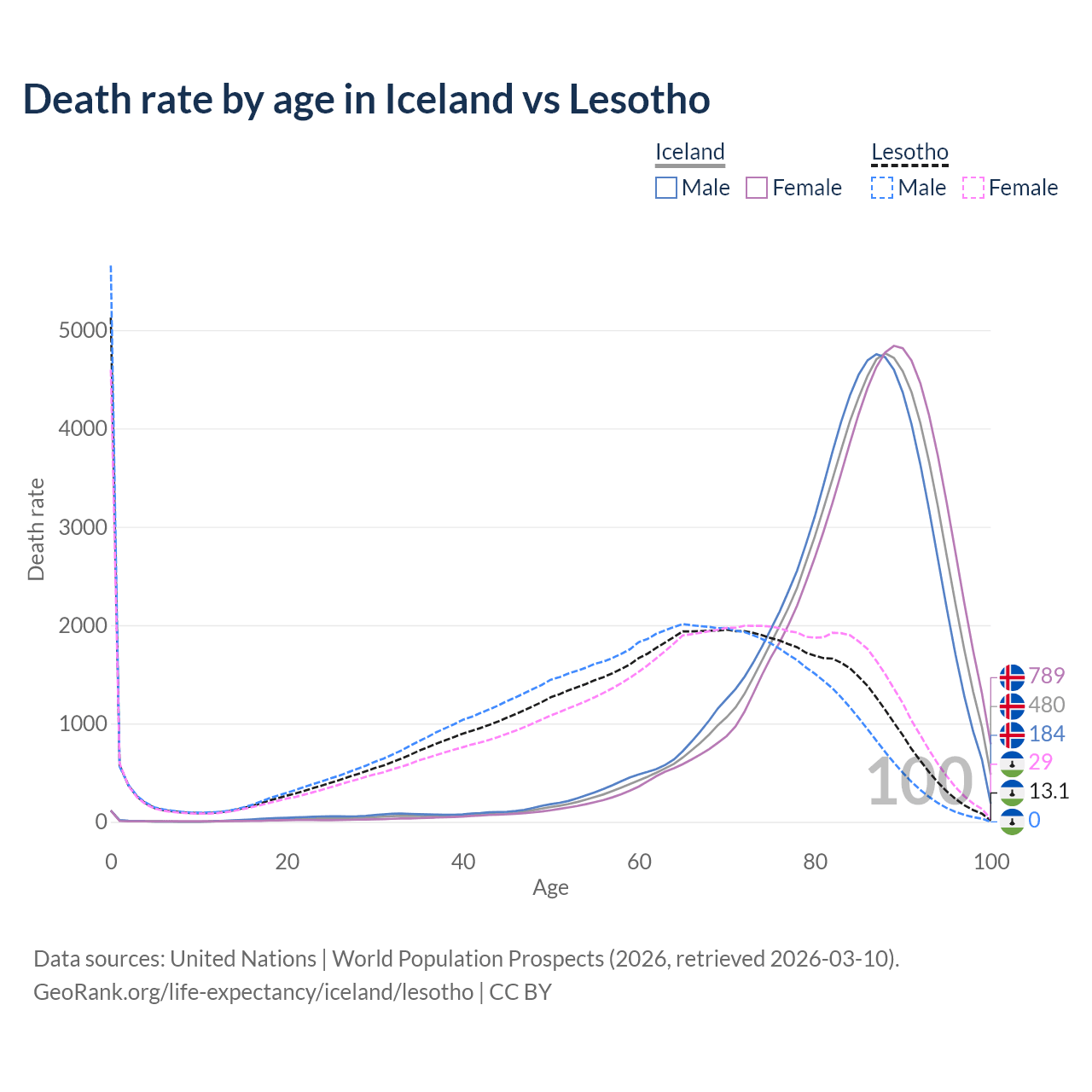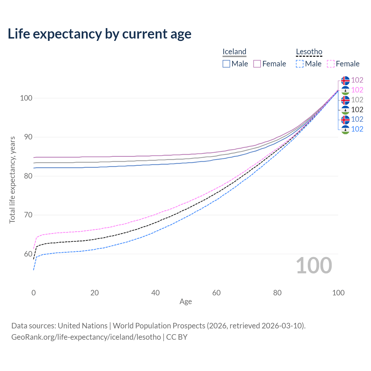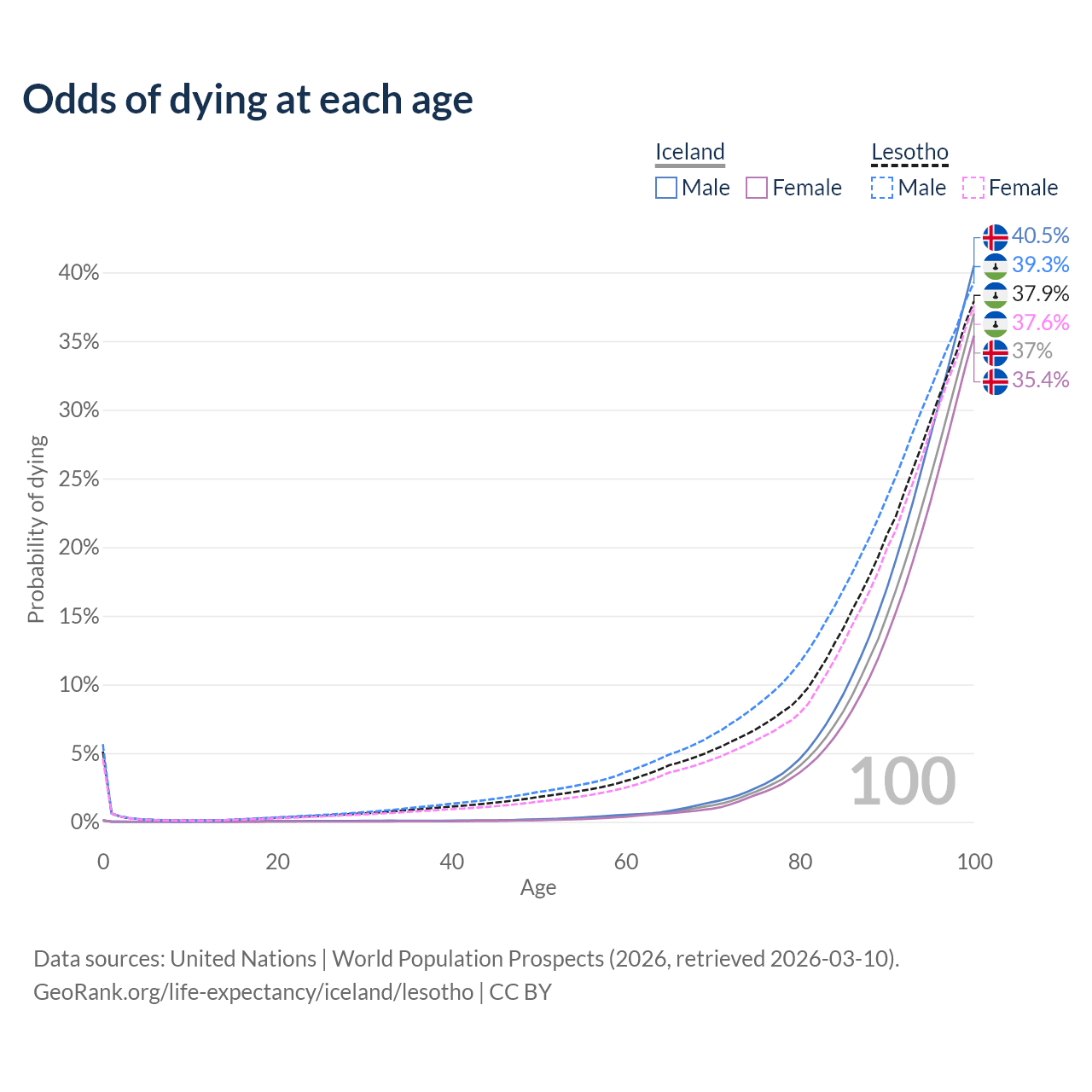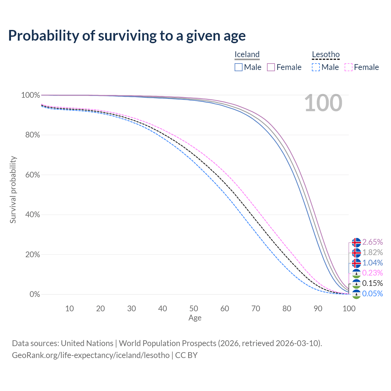 This life expectancy calculator shows the odds of living to 100, 95, 90, and below based on current age for both males and females in Iceland and Lesotho, along with mean and median age of death. The calculations are based on the 2026 life tables (actuarial tables) from the UN World Population Prospects.