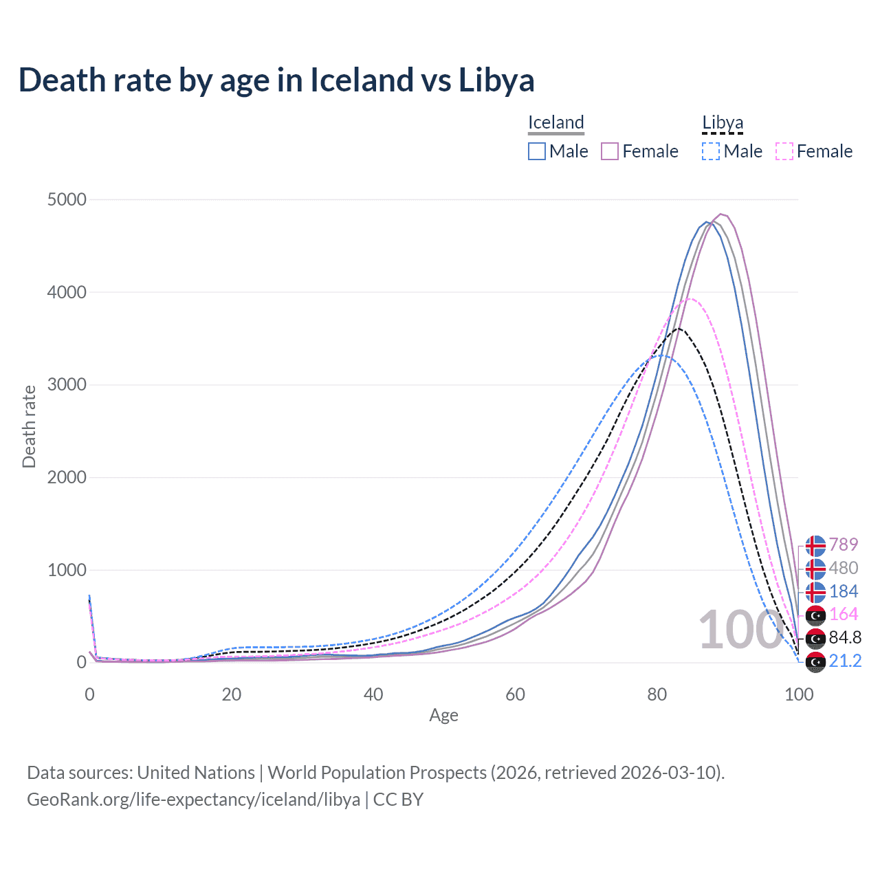 In Iceland, the most common age of death is 88, compared to 83 in Libya. The median age of death is 85.9 in Iceland and 78.8 in Libya, meaning only half of each cohort is expected to live past that age.