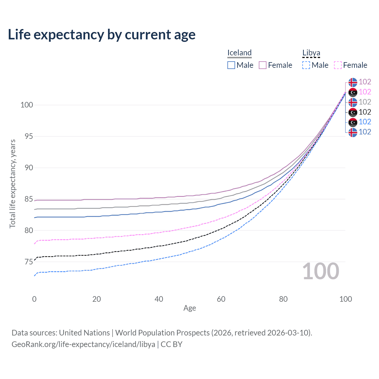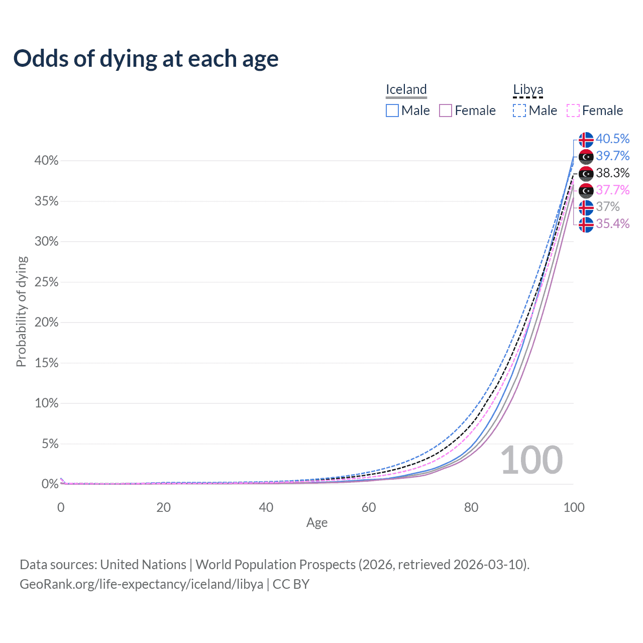 This life expectancy calculator shows the odds of living to 100, 95, 90, and below based on current age for both males and females in Iceland and Libya, along with mean and median age of death. The calculations are based on the 2026 life tables (actuarial tables) from the UN World Population Prospects.