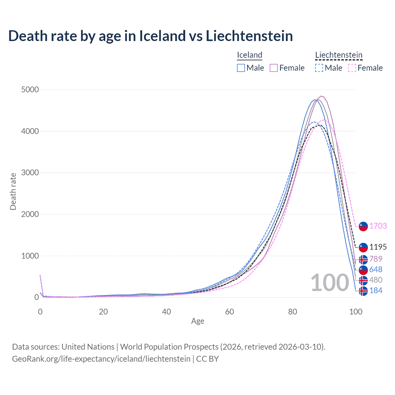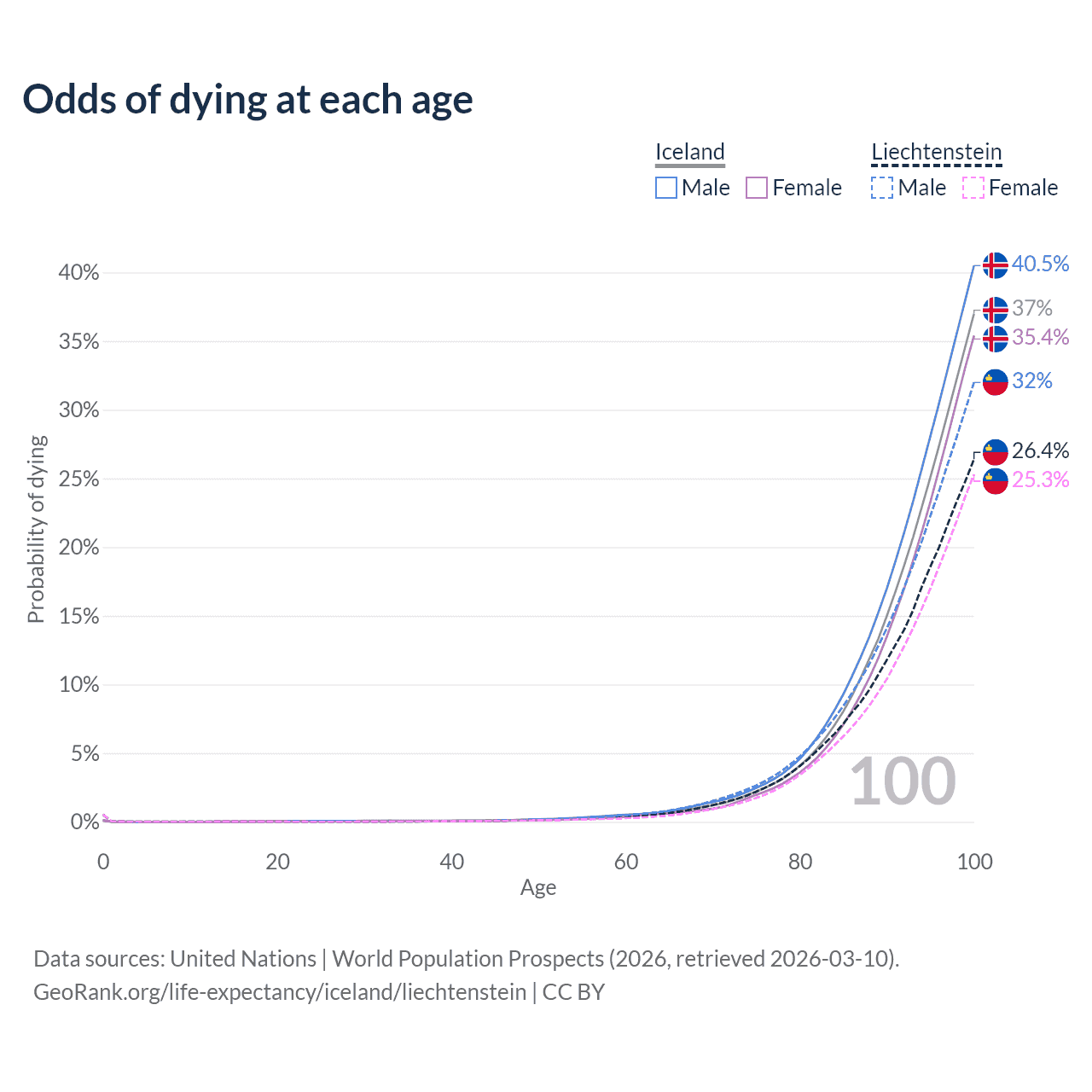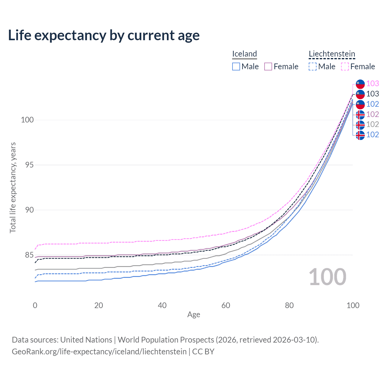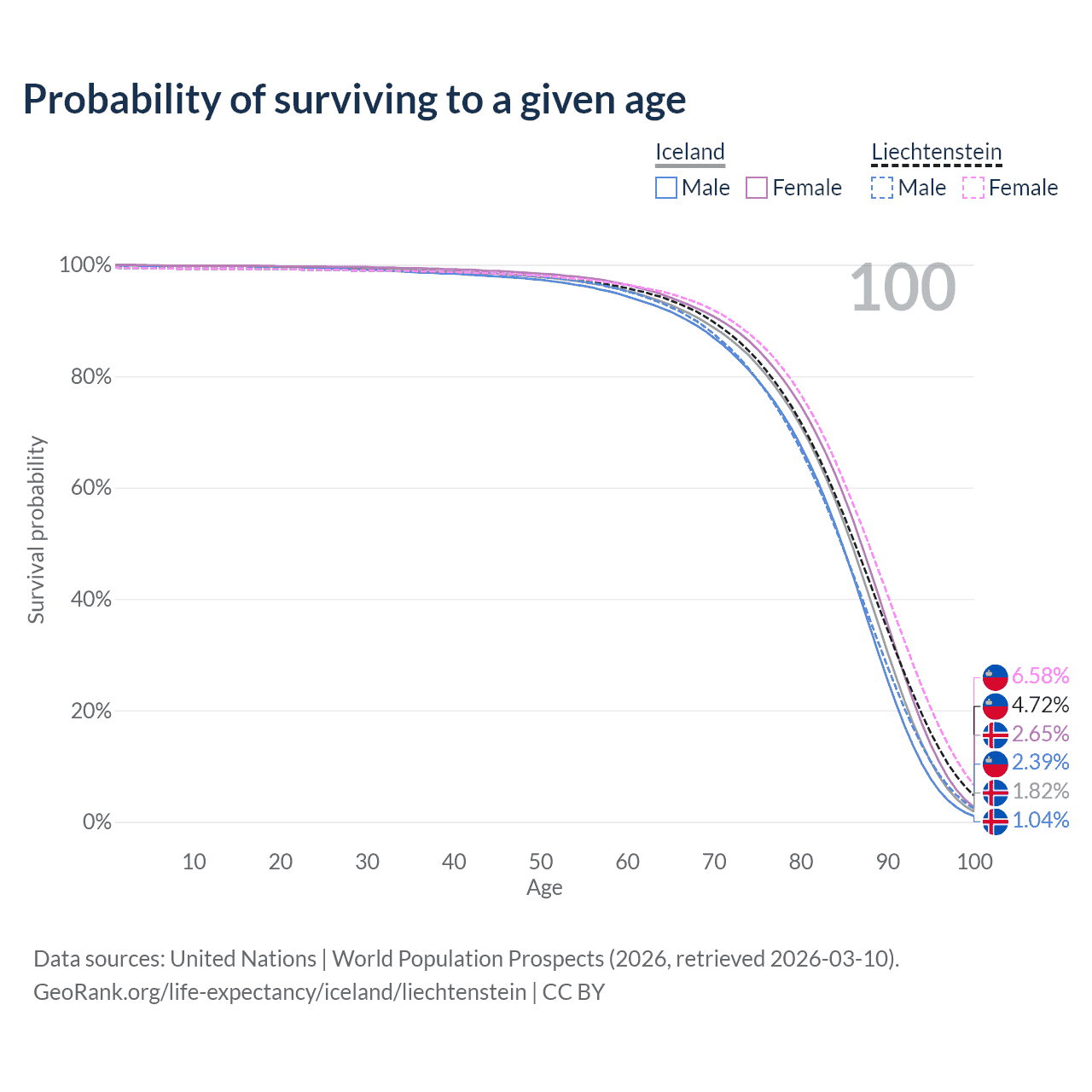 This life expectancy calculator shows the odds of living to 100, 95, 90, and below based on current age for both males and females in Iceland and Liechtenstein, along with mean and median age of death. The calculations are based on the 2026 life tables (actuarial tables) from the UN World Population Prospects.