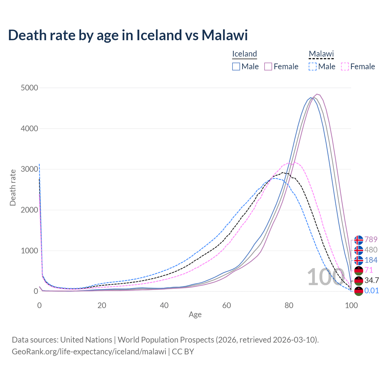 This life expectancy calculator shows the odds of living to 100, 95, 90, and below based on current age for both males and females in Iceland and Malawi, along with mean and median age of death. The calculations are based on the 2026 life tables (actuarial tables) from the UN World Population Prospects.