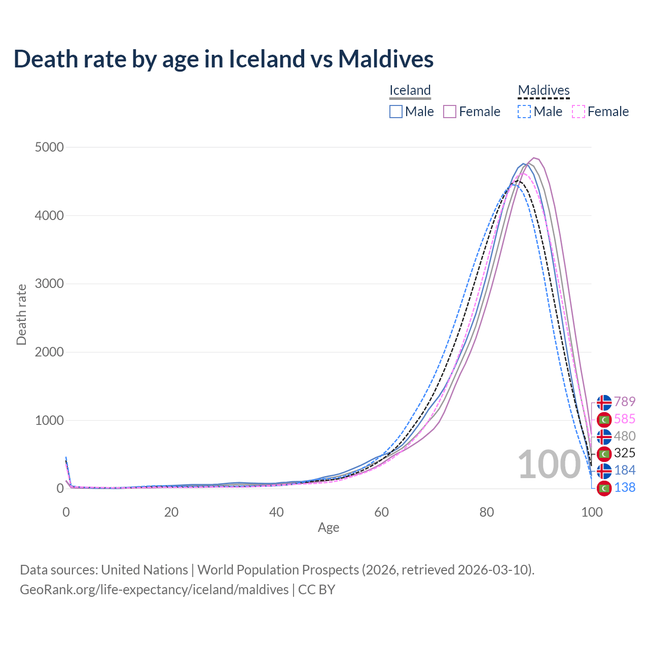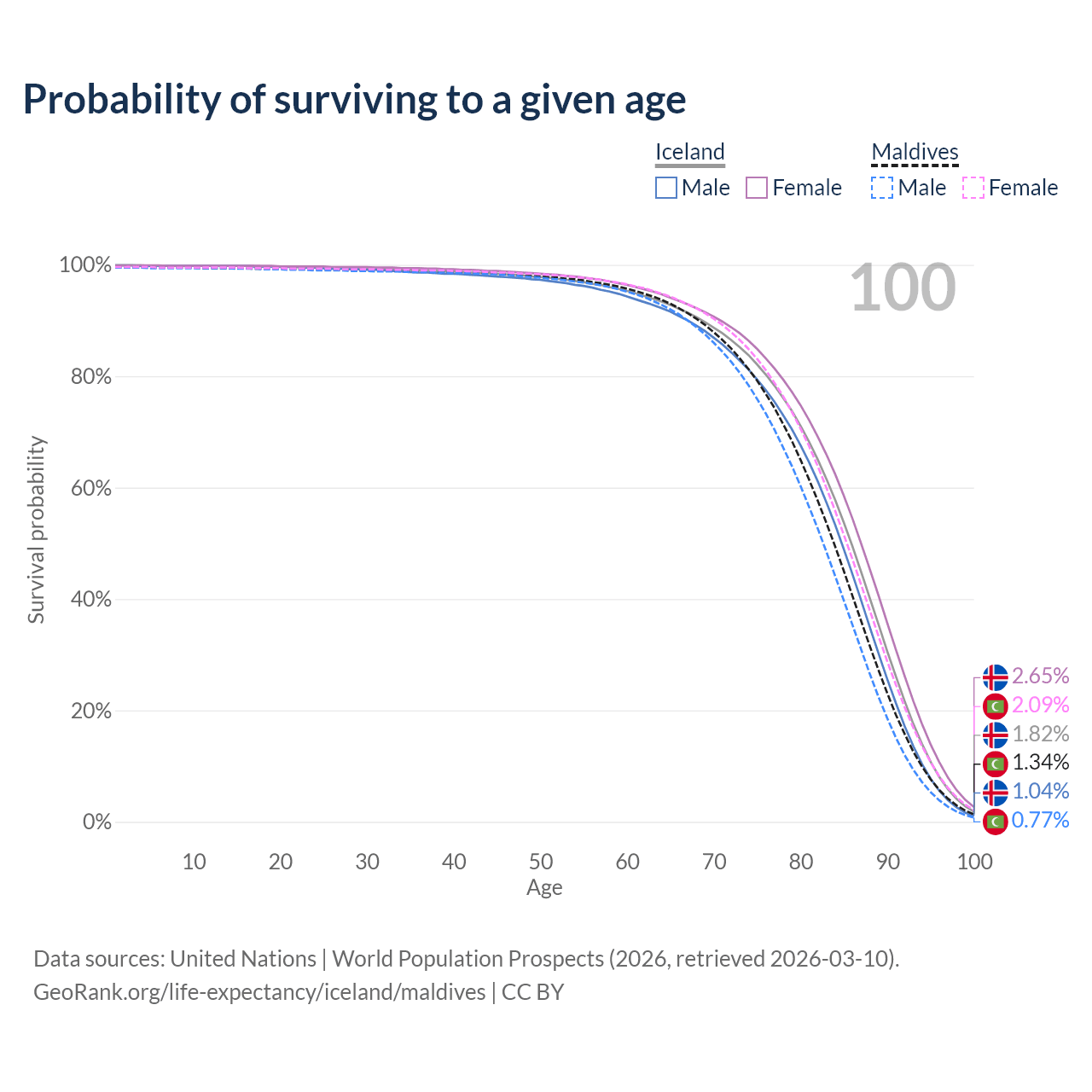 This life expectancy calculator shows the odds of living to 100, 95, 90, and below based on current age for both males and females in Iceland and Maldives, along with mean and median age of death. The calculations are based on the 2026 life tables (actuarial tables) from the UN World Population Prospects.