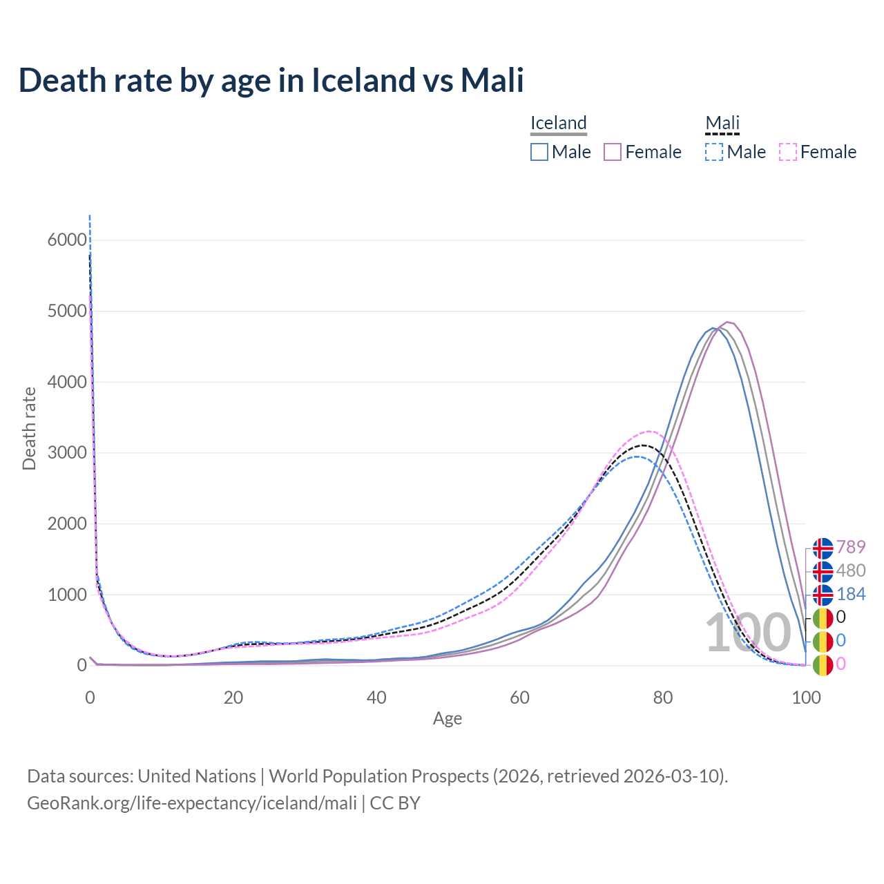 In Iceland, the most common age of death is 88, compared to 0 in Mali. The median age of death is 85.9 in Iceland and 70.2 in Mali, meaning only half of each cohort is expected to live past that age.