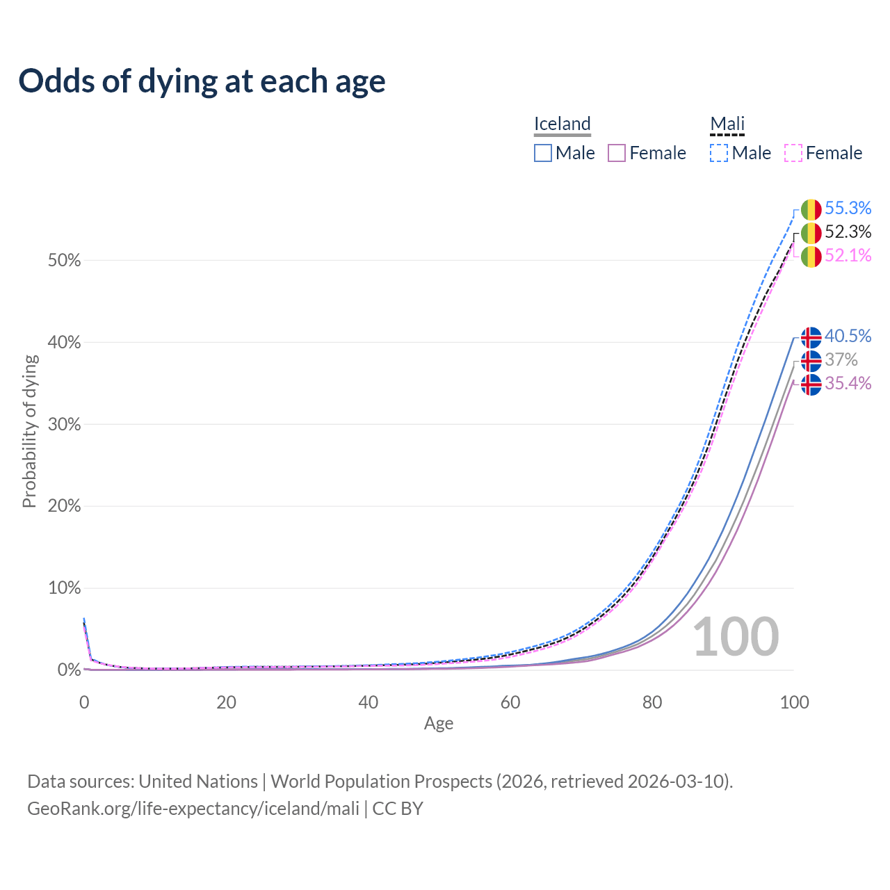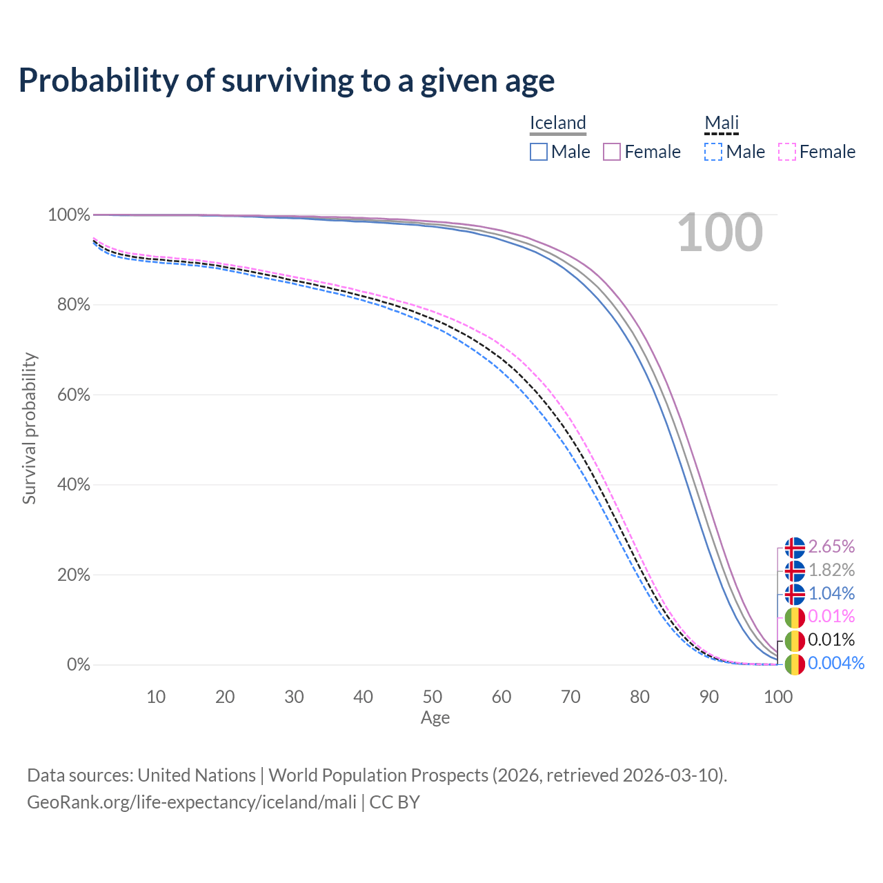 This life expectancy calculator shows the odds of living to 100, 95, 90, and below based on current age for both males and females in Iceland and Mali, along with mean and median age of death. The calculations are based on the 2026 life tables (actuarial tables) from the UN World Population Prospects.