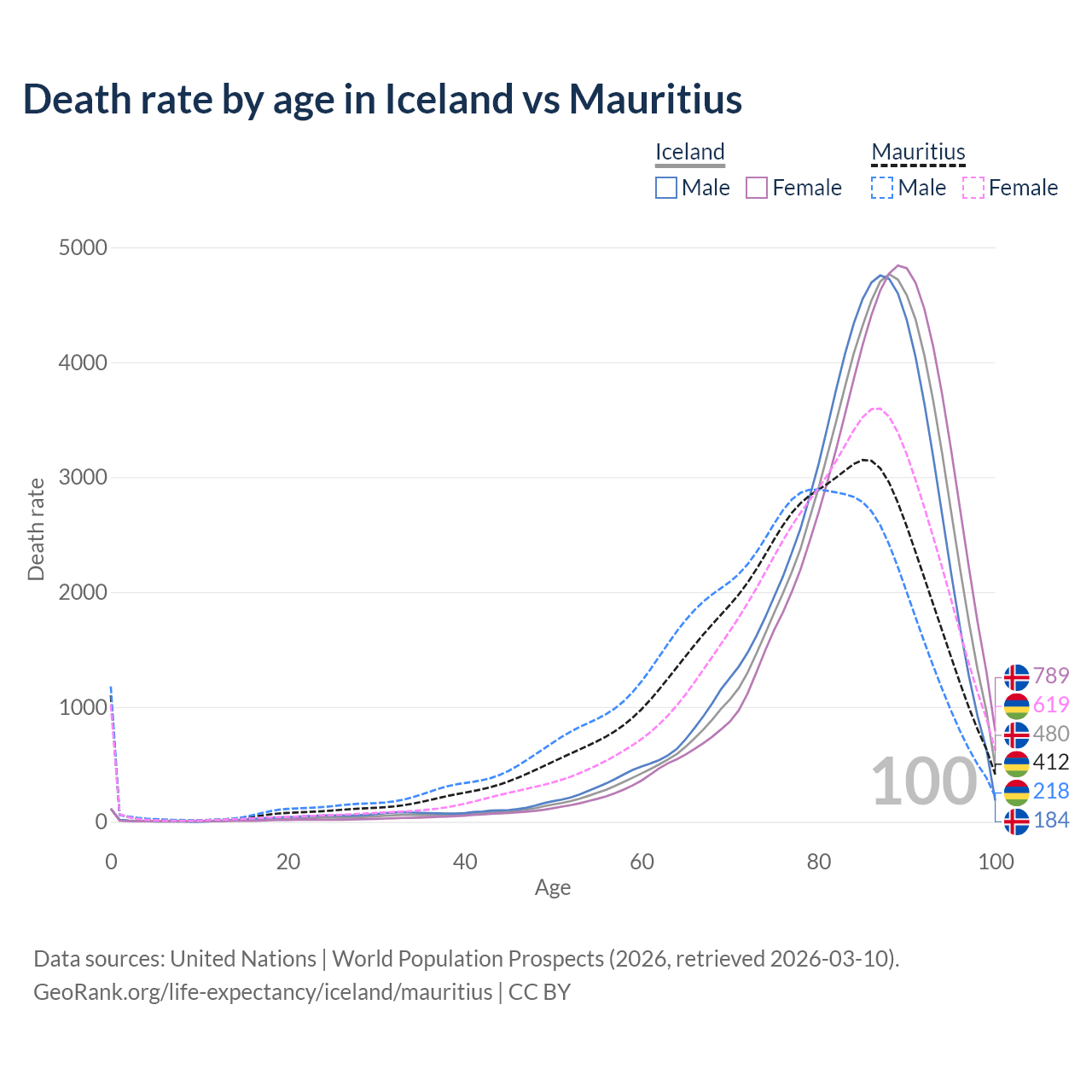 In Iceland, the most common age of death is 88, compared to 85 in Mauritius. The median age of death is 85.9 in Iceland and 79.1 in Mauritius, meaning only half of each cohort is expected to live past that age.