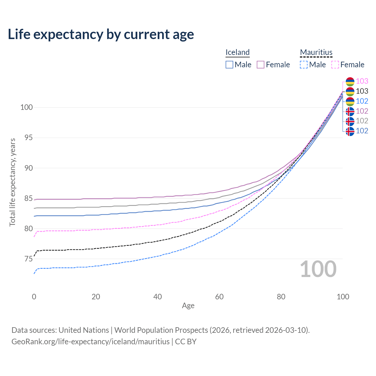 This life expectancy calculator shows the odds of living to 100, 95, 90, and below based on current age for both males and females in Iceland and Mauritius, along with mean and median age of death. The calculations are based on the 2026 life tables (actuarial tables) from the UN World Population Prospects.