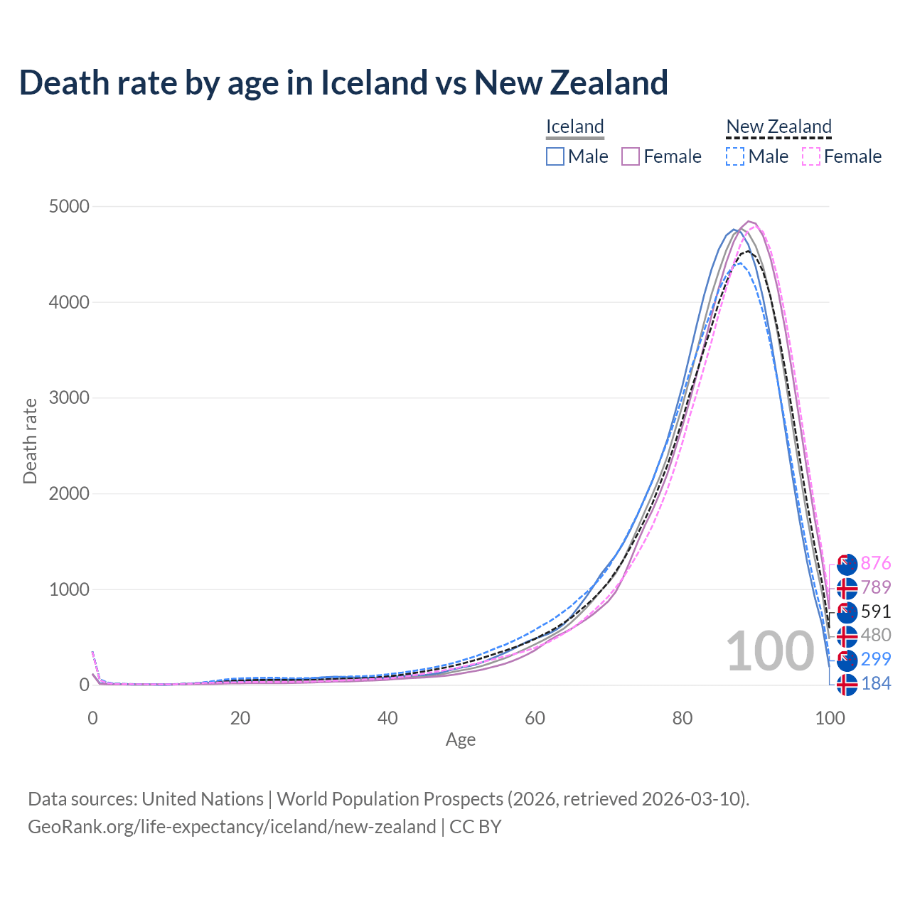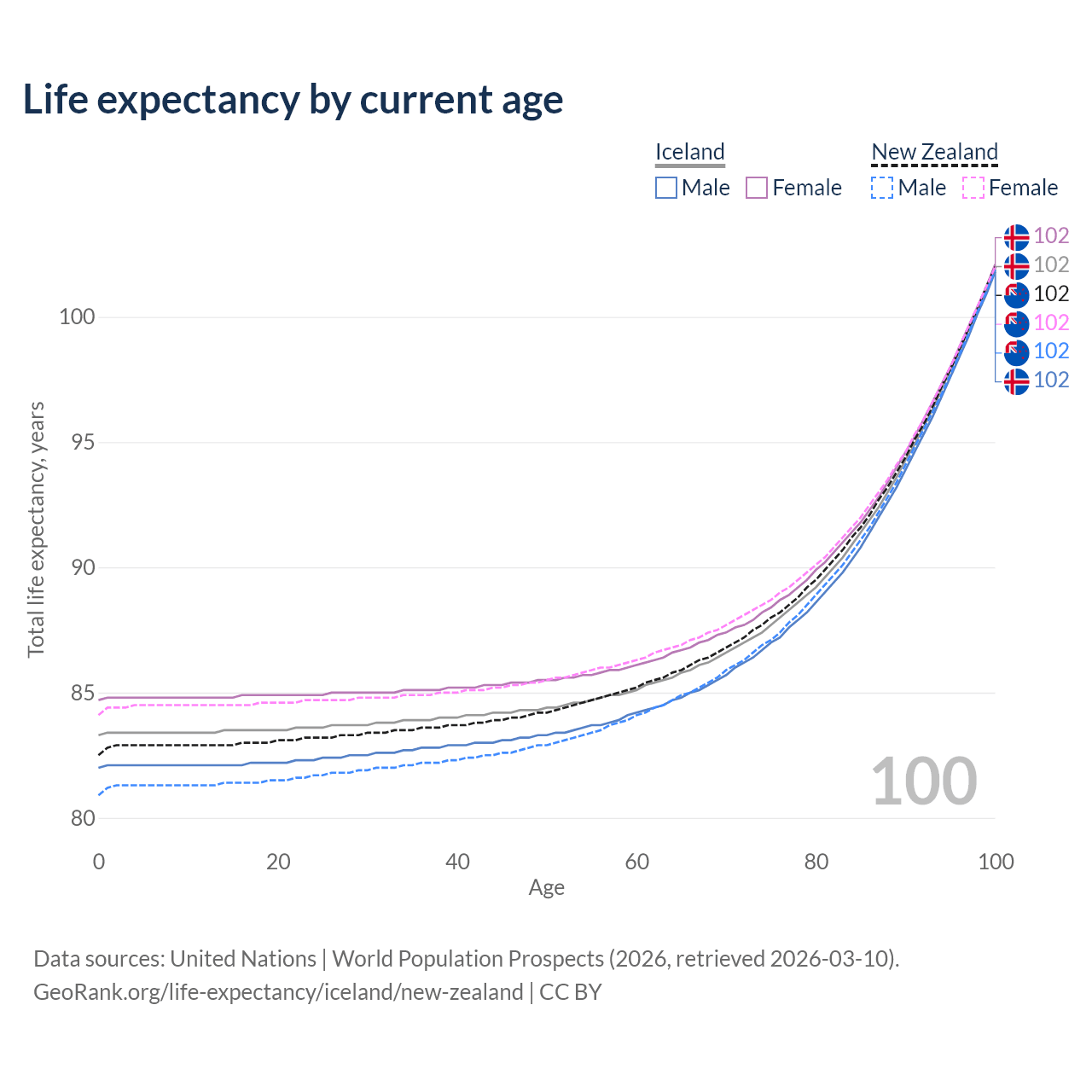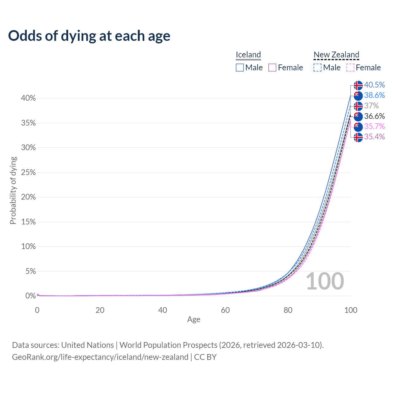This life expectancy calculator shows the odds of living to 100, 95, 90, and below based on current age for both males and females in Iceland and New Zealand, along with mean and median age of death. The calculations are based on the 2026 life tables (actuarial tables) from the UN World Population Prospects.