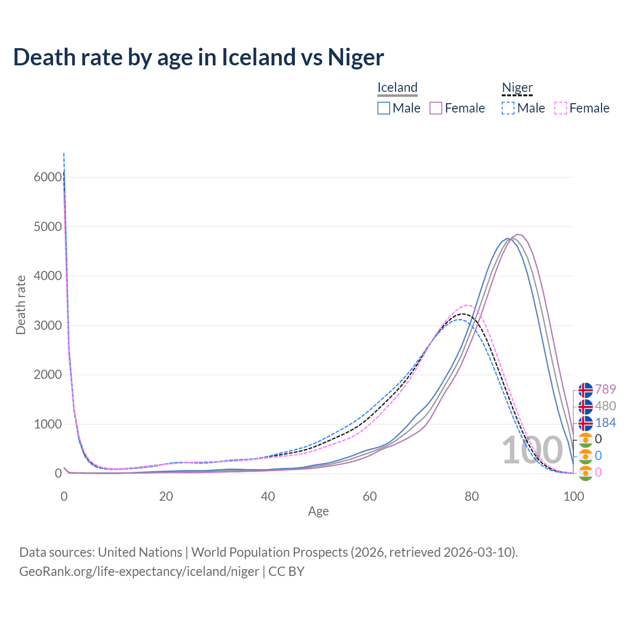 In Iceland, the most common age of death is 88, compared to 0 in Niger. The median age of death is 85.9 in Iceland and 71.7 in Niger, meaning only half of each cohort is expected to live past that age.