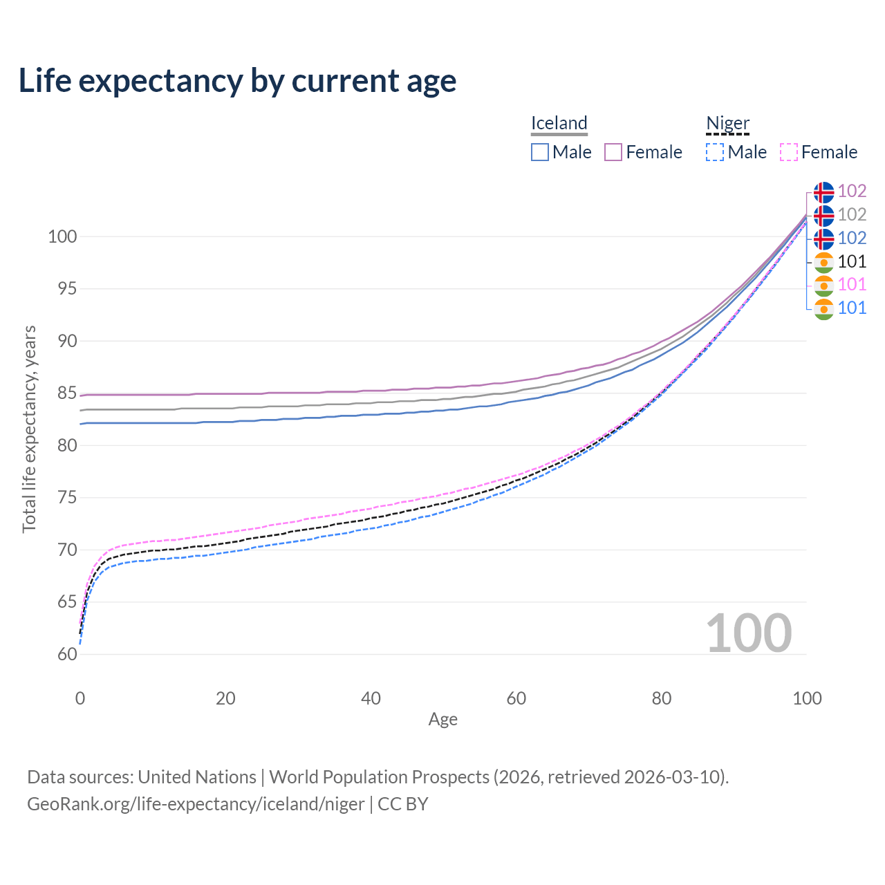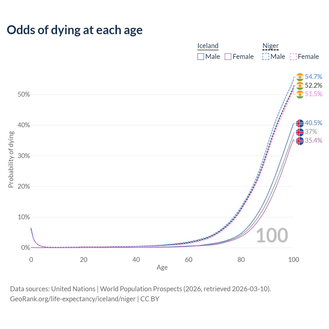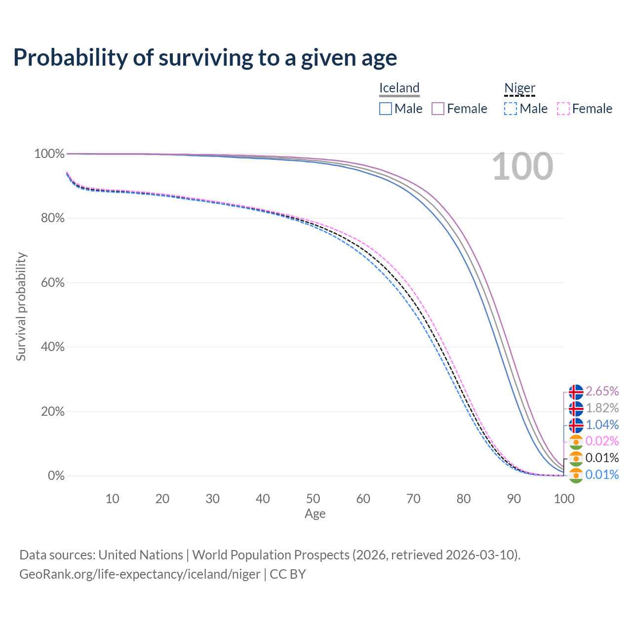 This life expectancy calculator shows the odds of living to 100, 95, 90, and below based on current age for both males and females in Iceland and Niger, along with mean and median age of death. The calculations are based on the 2026 life tables (actuarial tables) from the UN World Population Prospects.
