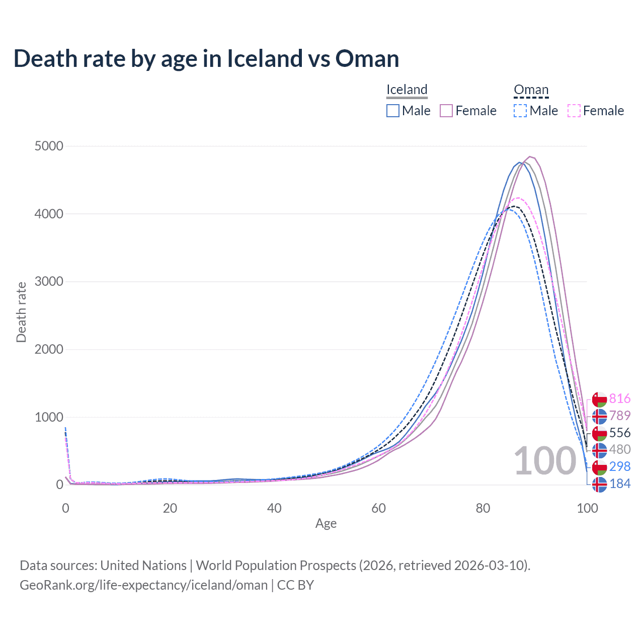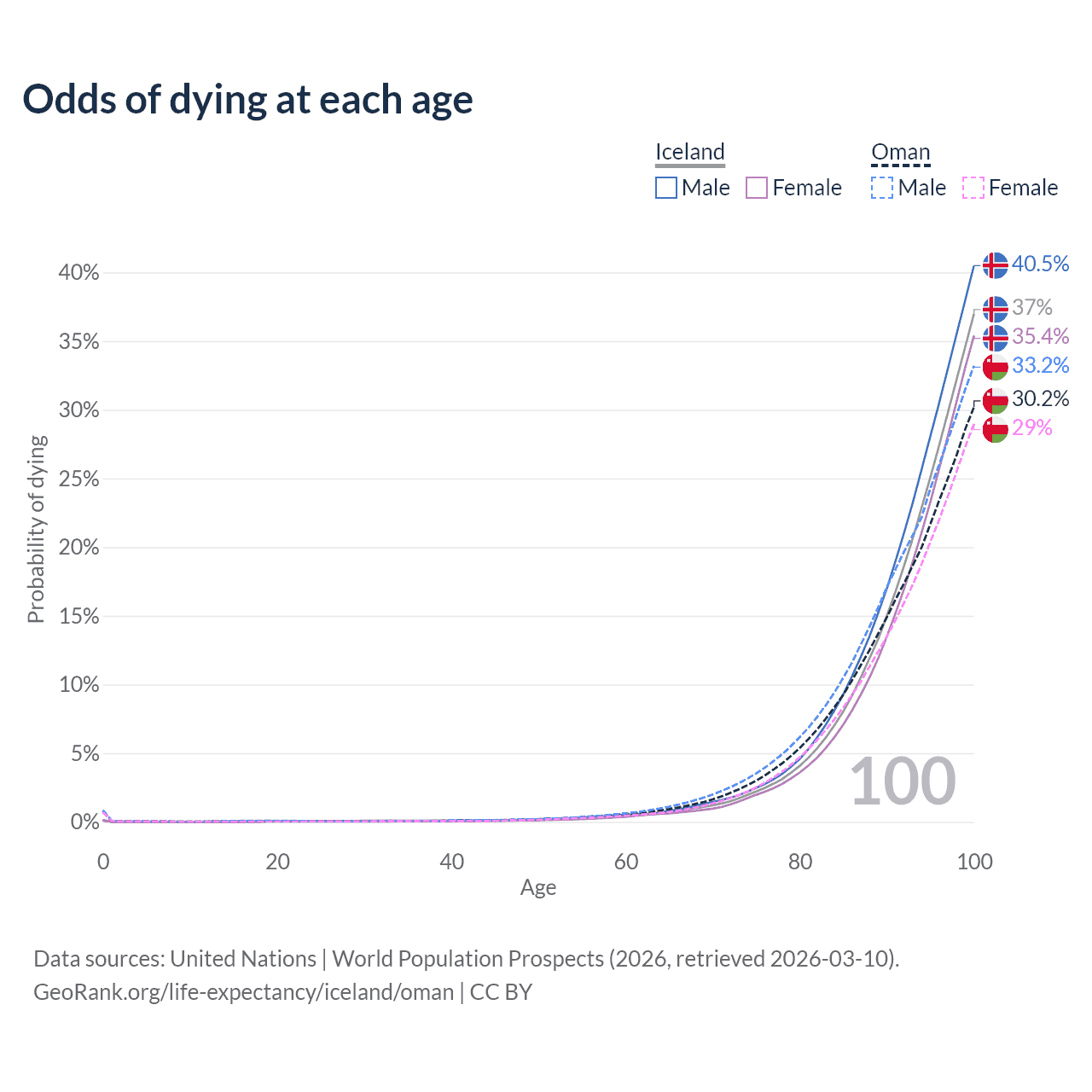 This life expectancy calculator shows the odds of living to 100, 95, 90, and below based on current age for both males and females in Iceland and Oman, along with mean and median age of death. The calculations are based on the 2026 life tables (actuarial tables) from the UN World Population Prospects.