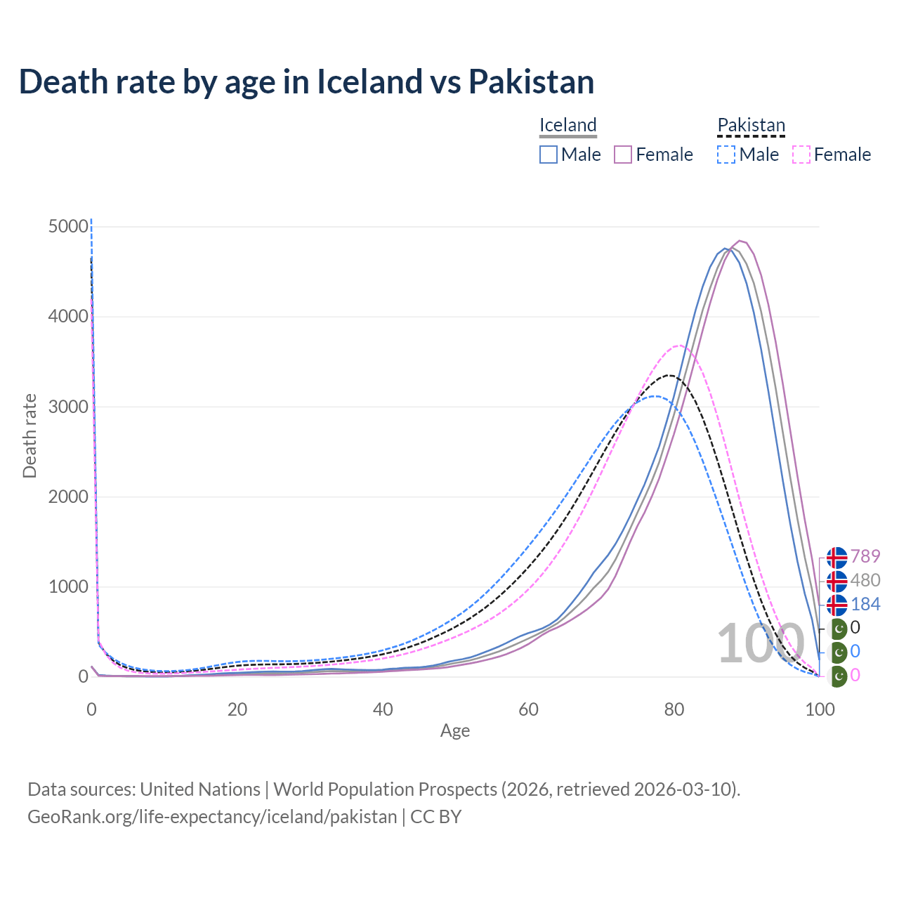 In Iceland, the most common age of death is 88, compared to 0 in Pakistan. The median age of death is 85.9 in Iceland and 74.3 in Pakistan, meaning only half of each cohort is expected to live past that age.