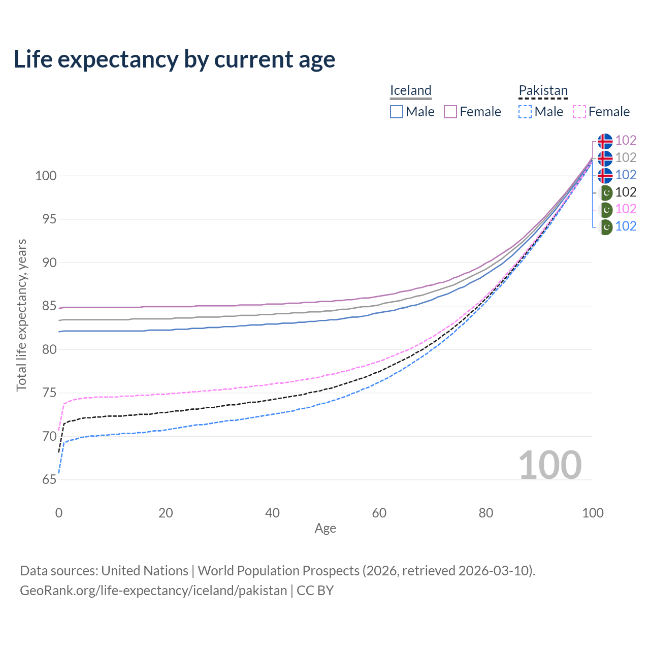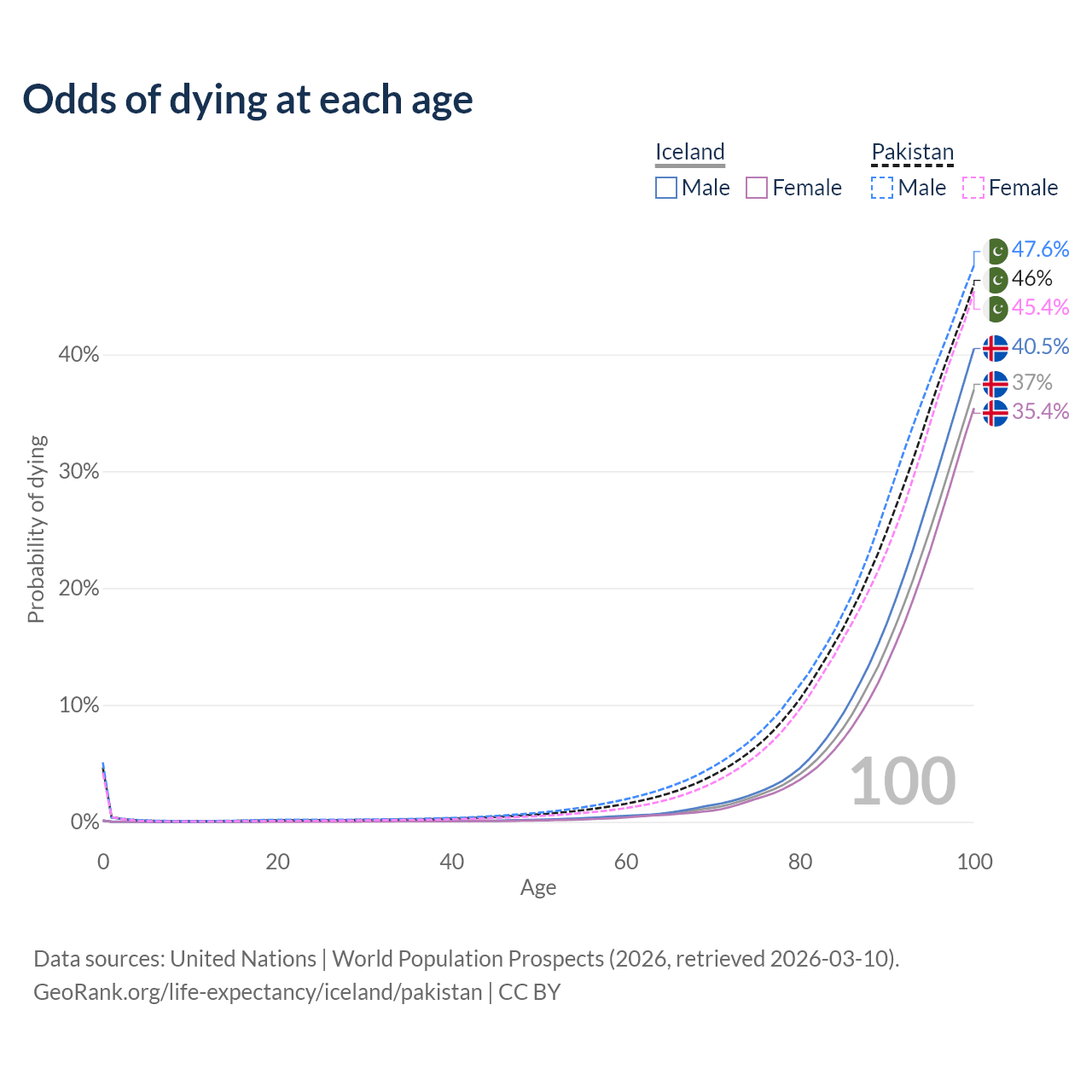 This life expectancy calculator shows the odds of living to 100, 95, 90, and below based on current age for both males and females in Iceland and Pakistan, along with mean and median age of death. The calculations are based on the 2026 life tables (actuarial tables) from the UN World Population Prospects.